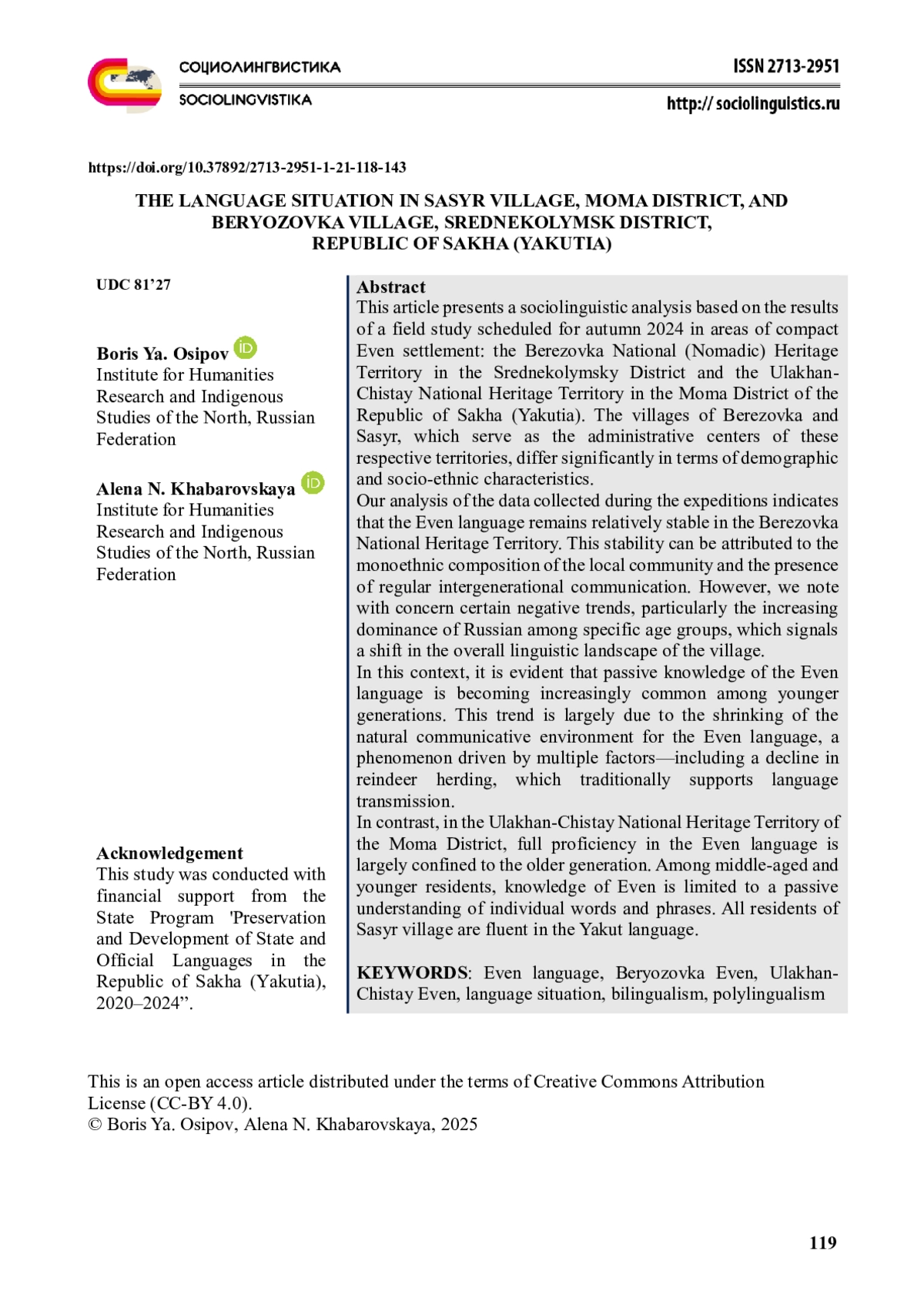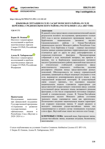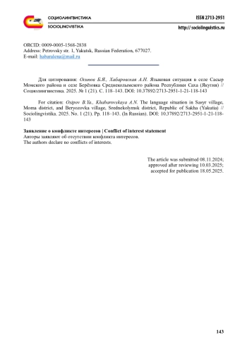 27. Vinokurova A., Khokholova I., Osipov B., Pavlov S., Tokhtobina Ya., Platonova V. (2022) The Language Situation in the Eveno-Bytantaiskii National District of the Republic of Sakha (Yakutia) Sibirica. Vol. 21, Issue 3. p. 159-194. EDN: OSCVJT