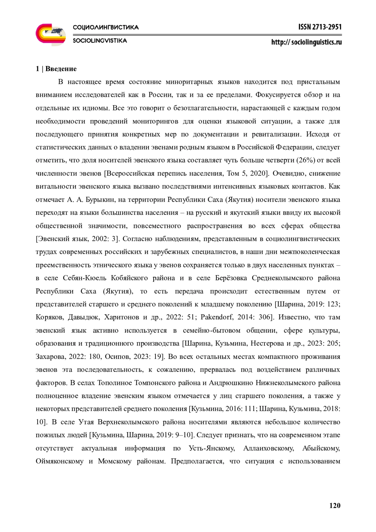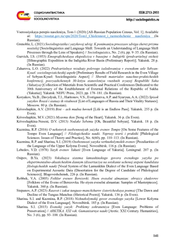 19. Шарина С.И. (2019) Языковая ситуация у коренных малочисленных народов Севера в Республике Саха (Якутия) Коренные малочисленные народы Российской Федерации… Якутск, ФИЦ “Якутский научный центр СО РАН”. С. 121-130. EDN: ORWQHM