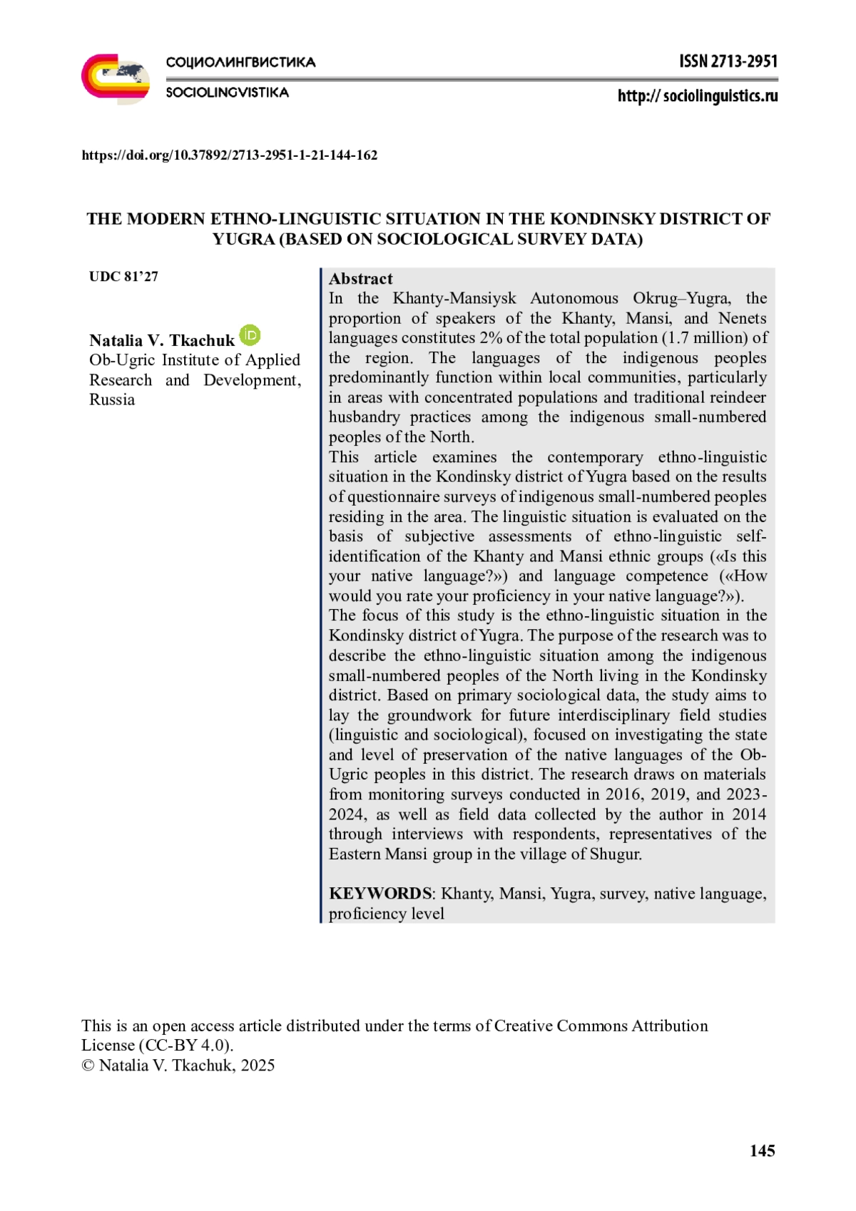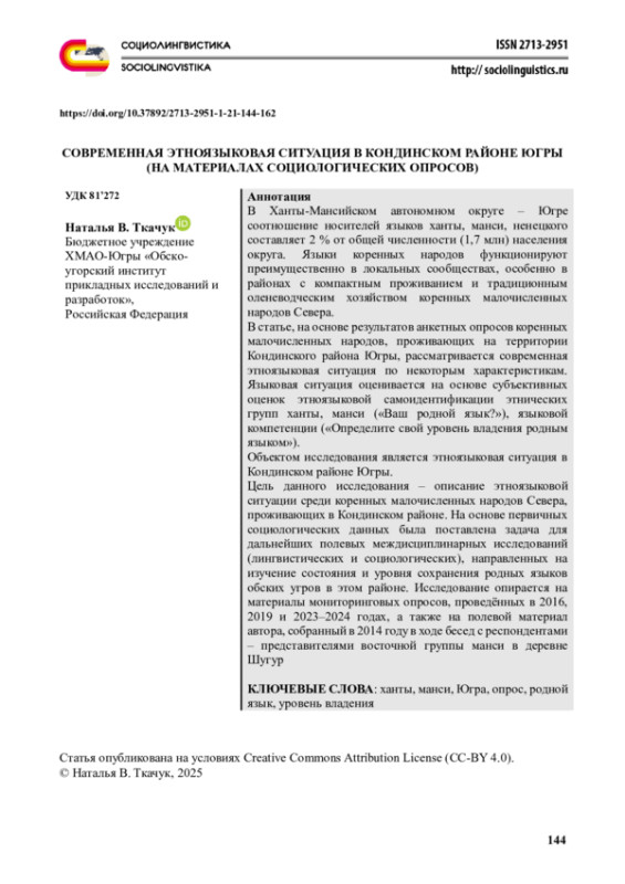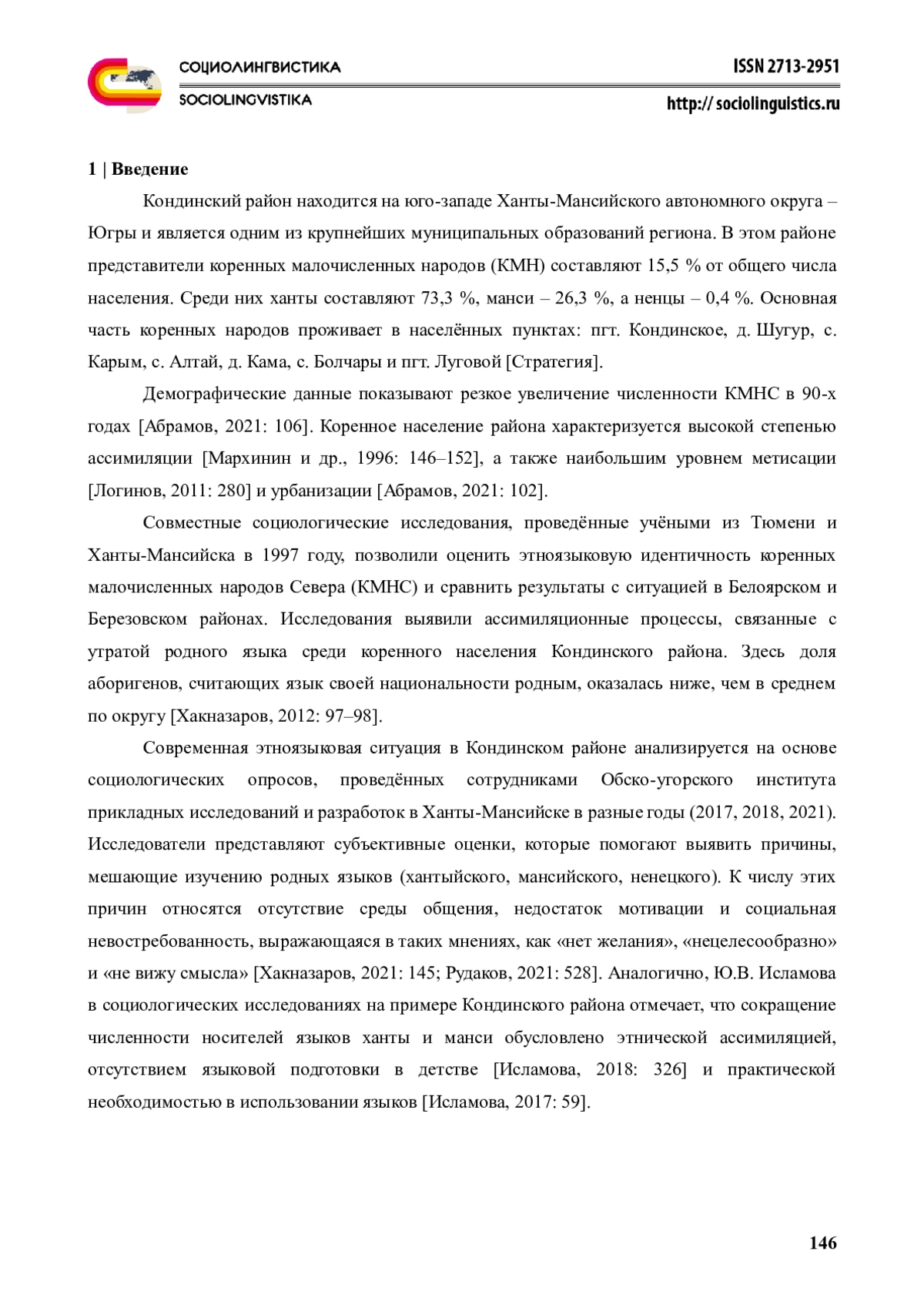 16. Хакназаров С.Х. (2021) Современное состояние родных языков коренных народов Севера, на примере Кондинского района ХМАО-Югры, Социальные науки. № 1(32). С. 141-151. EDN: CBCMNY