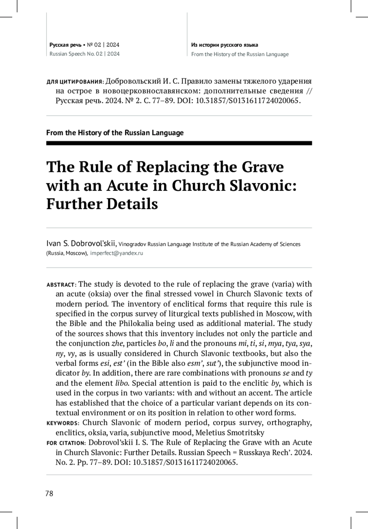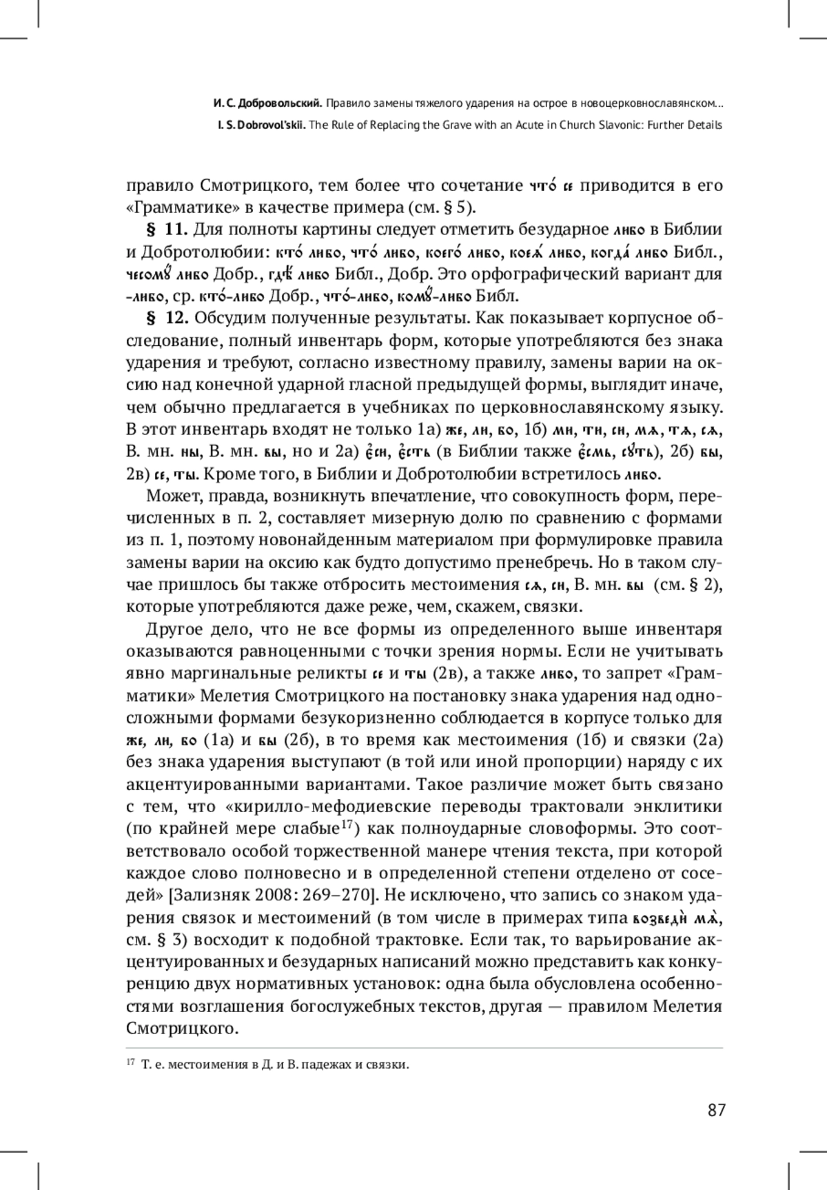 Настоящая работа посвящена правилу замены тяжелого ударения (варии) на острое (оксию) над конечной ударной гласной в церковнославянских текстах Нового времени. Инвентарь энклитических форм, которые требуют соблюдения этого правила, уточняется в ходе корпусного обследования богослужебных текстов, изданных в Москве; в качестве дополнительного материала привлекаются Библия и Добротолюбие. Изучение источников показывает, что в этот инвентарь входят не только частица и союз же, частицы бо, ли и местоименные формы ми, ти, си, мя, тя, ся, ны, вы, как обычно считается в учебниках церковнославянского языка, но и связки еси, есть (в Библии также есмь, суть), показатель сослагательного наклонения бы; кроме того, зафиксированы редкие сочетания с полноударными местоимениями (что́ се, что́ ты, почто́ ты) и элементом либо (например, кто́ либо). Особое внимание уделяется элементу бы, который может записываться в корпусе как со знаком ударения, так и без знака; установлено, что выбор конкретного написания зависит от его контекстного окружения или от позиции по отношению к другим словоформам