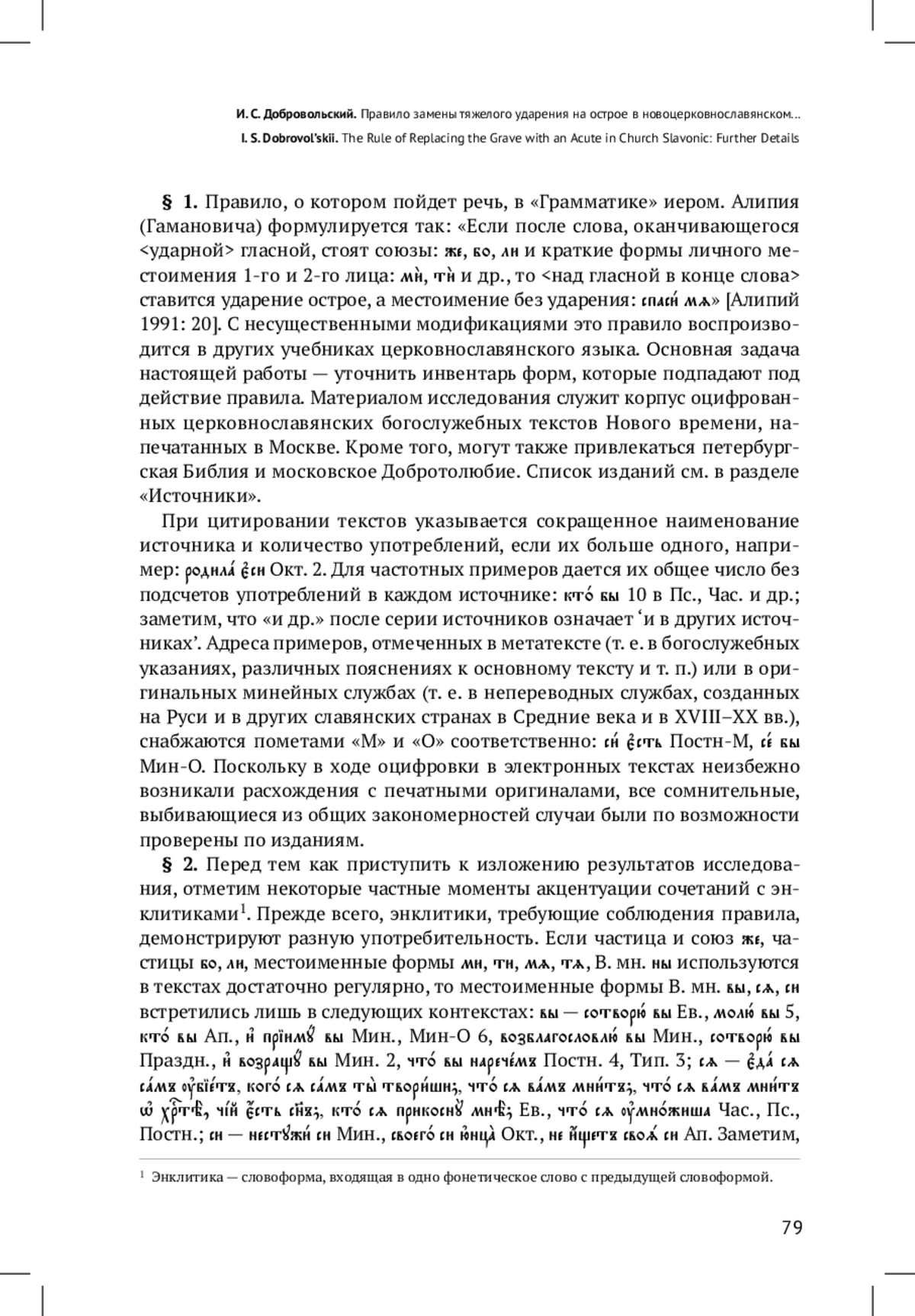 Правило, о котором пойдет речь, в «Грамматике» иером. Алипия (Гамановича) формулируется так: «Если после слова, оканчивающегося <ударной> гласной, стоят союзы: же, бо, ли и краткие формы личного местоимения 1-го и 2-го лица: мѝ, тѝ и др., то <над гласной в конце слова> ставится ударение острое, а местоимение без ударения: спаси́ мѧ» [Алипий 1991: 20]. С несущественными модификациями это правило воспроизводится в других учебниках церковнославянского языка. Основная задача настоящей работы — уточнить инвентарь форм, которые подпадают под действие правила. Материалом исследования служит корпус оцифрованных церковнославянских богослужебных текстов Нового времени, напечатанных в Москве. Кроме того, могут также привлекаться петербургская Библия и московское Добротолюбие. Список изданий см. в разделе «Источ ники»