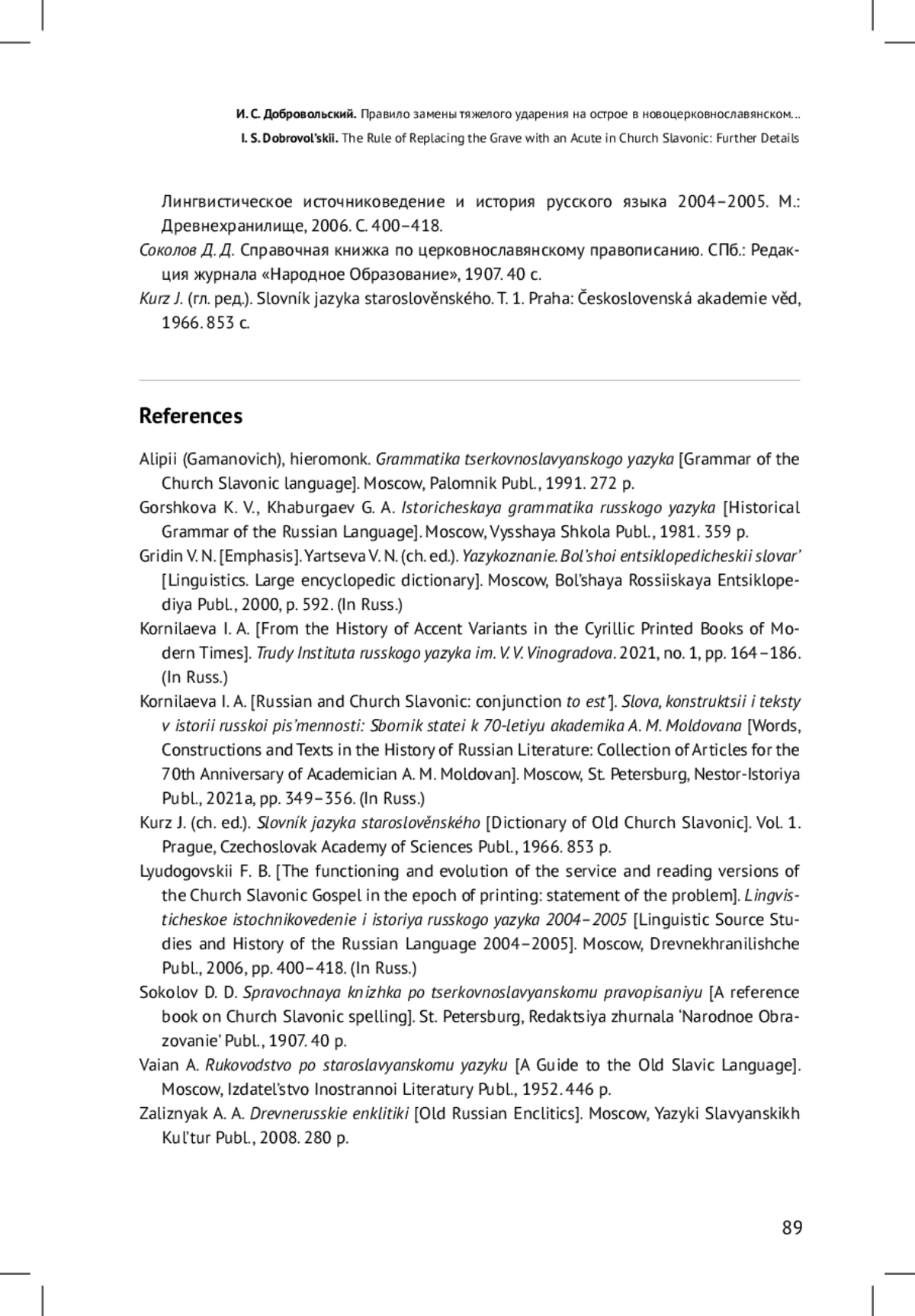 7. Корнилаева И. А. Русский с церковнославянским: союз то есть // Слова, конструкции и тексты в истории русской письменности: Сборник статей к 70-летию академика А. М. Молдована. М., СПб.: Нестор-История, 2021а. С. 349-356. EDN: AXHULX