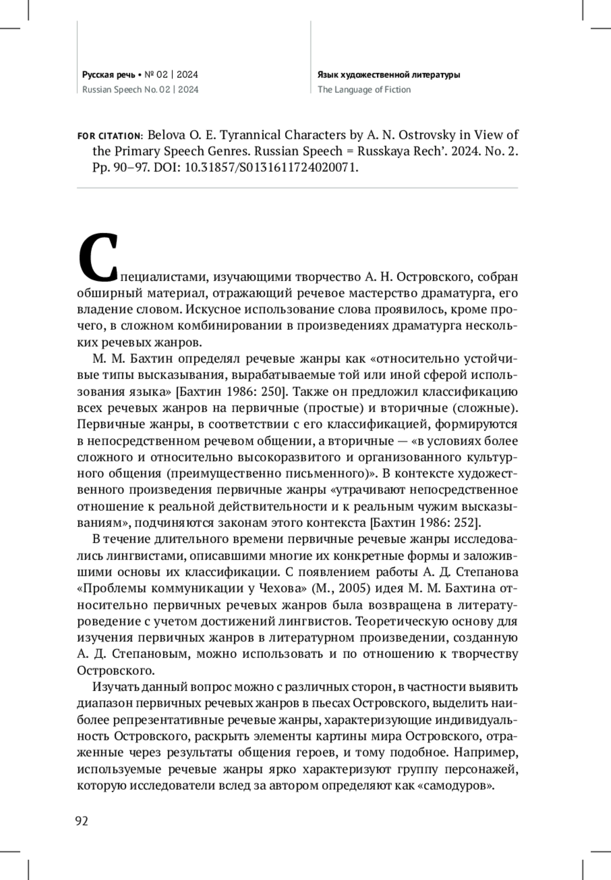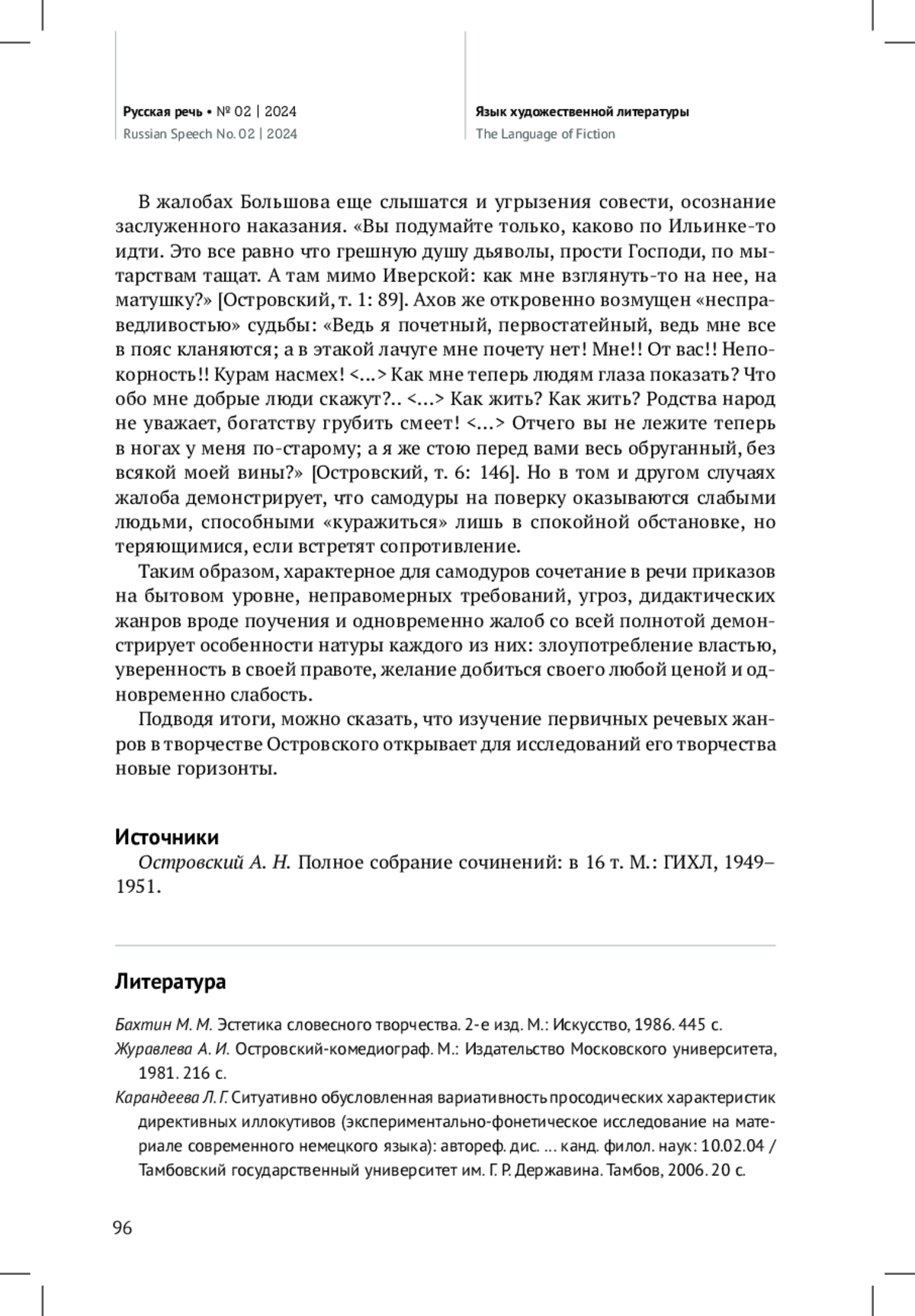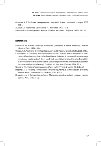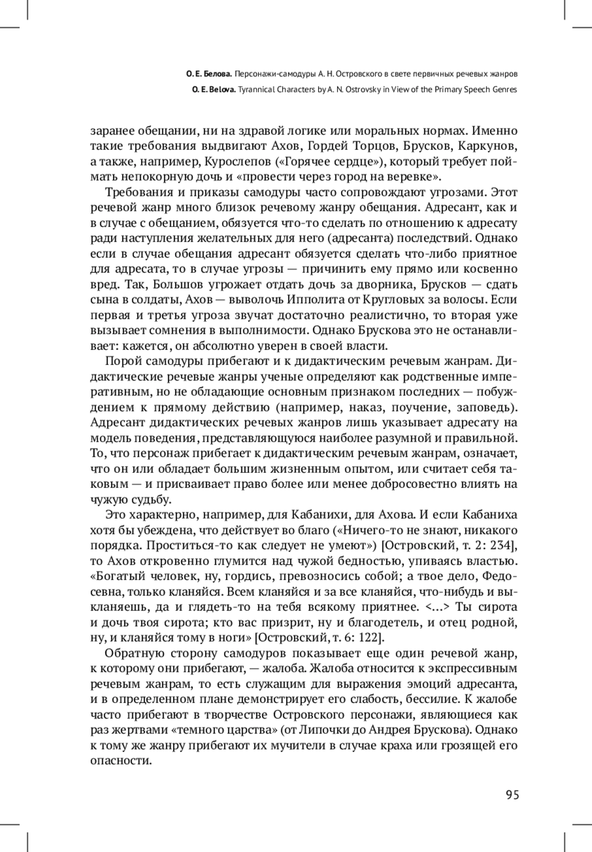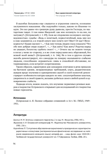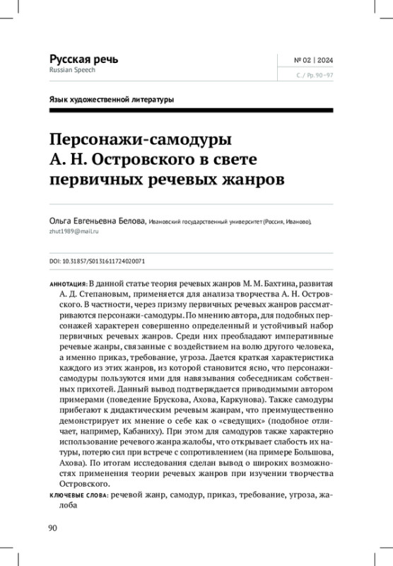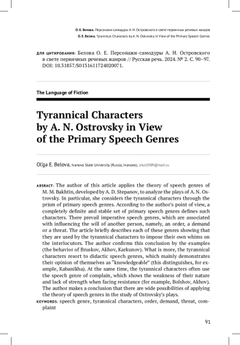 В данной статье теория речевых жанров М. М. Бахтина, развитая А. Д. Степановым, применяется для анализа творчества А. Н. Островского. В частности, через призму первичных речевых жанров рассматриваются персонажи-самодуры. По мнению автора, для подобных персонажей характерен совершенно определенный и устойчивый набор первичных речевых жанров. Среди них преобладают императивные речевые жанры, связанные с воздействием на волю другого человека, а именно приказ, требование, угроза. Дается краткая характеристика каждого из этих жанров, из которой становится ясно, что персонажисамодуры пользуются ими для навязывания собеседникам собственных прихотей. Данный вывод подтверждается приводимыми автором примерами (поведение Брускова, Ахова, Каркунова). Также самодуры прибегают к дидактическим речевым жанрам, что преимущественно демонстрирует их мнение о себе как о «сведущих» (подобное отличает, например, Кабаниху). При этом для самодуров также характерно использование речевого жанра жалобы, что открывает слабость их натуры, потерю сил при встрече с сопротивлением (на примере Большова, Ахова). По итогам исследования сделан вывод о широких возможностях применения теории речевых жанров при изучении творчества Островского
