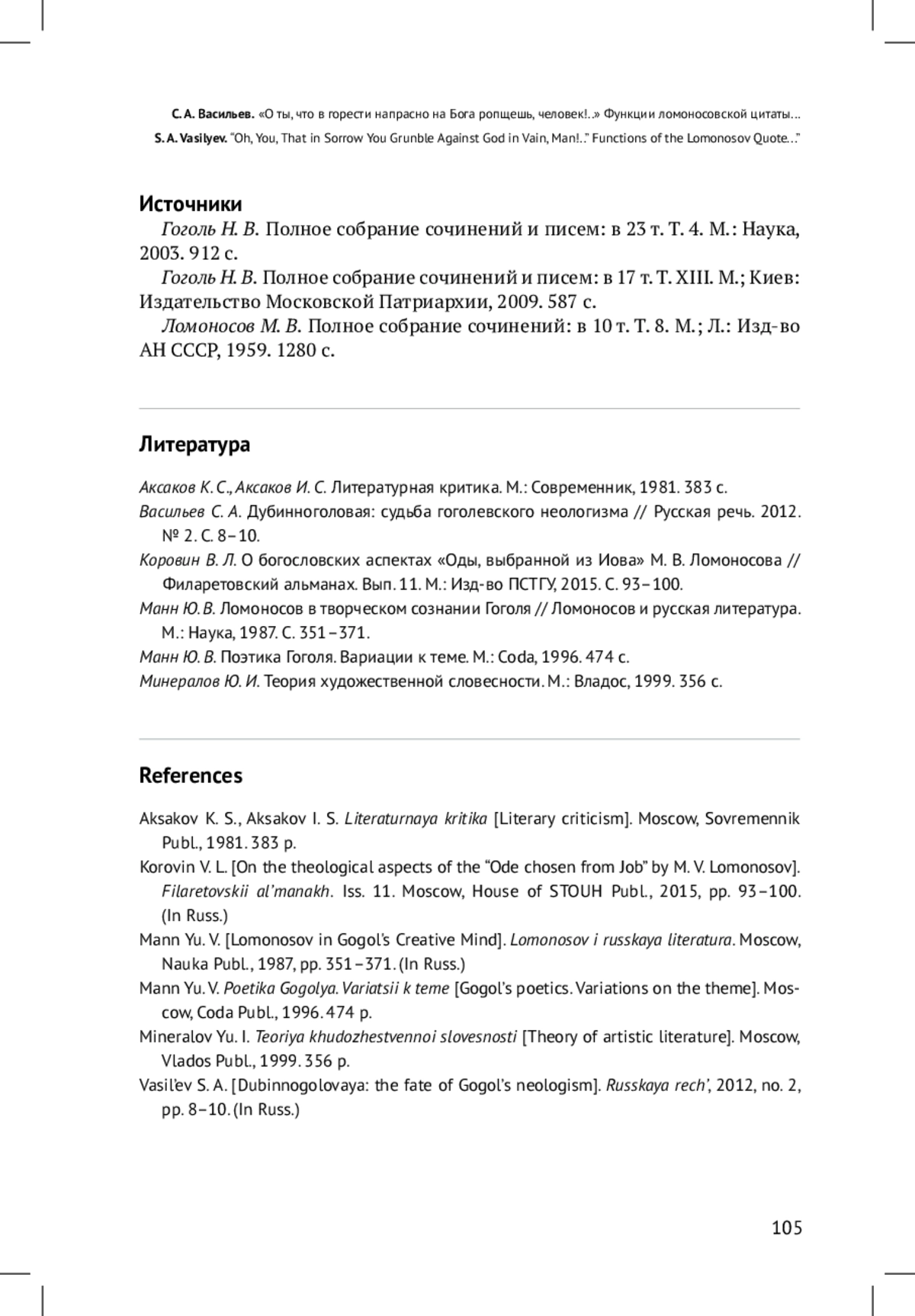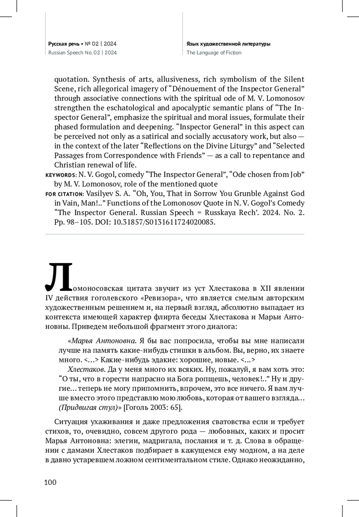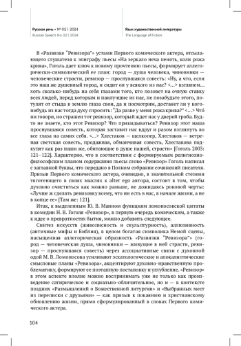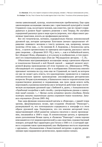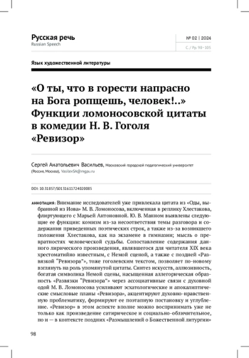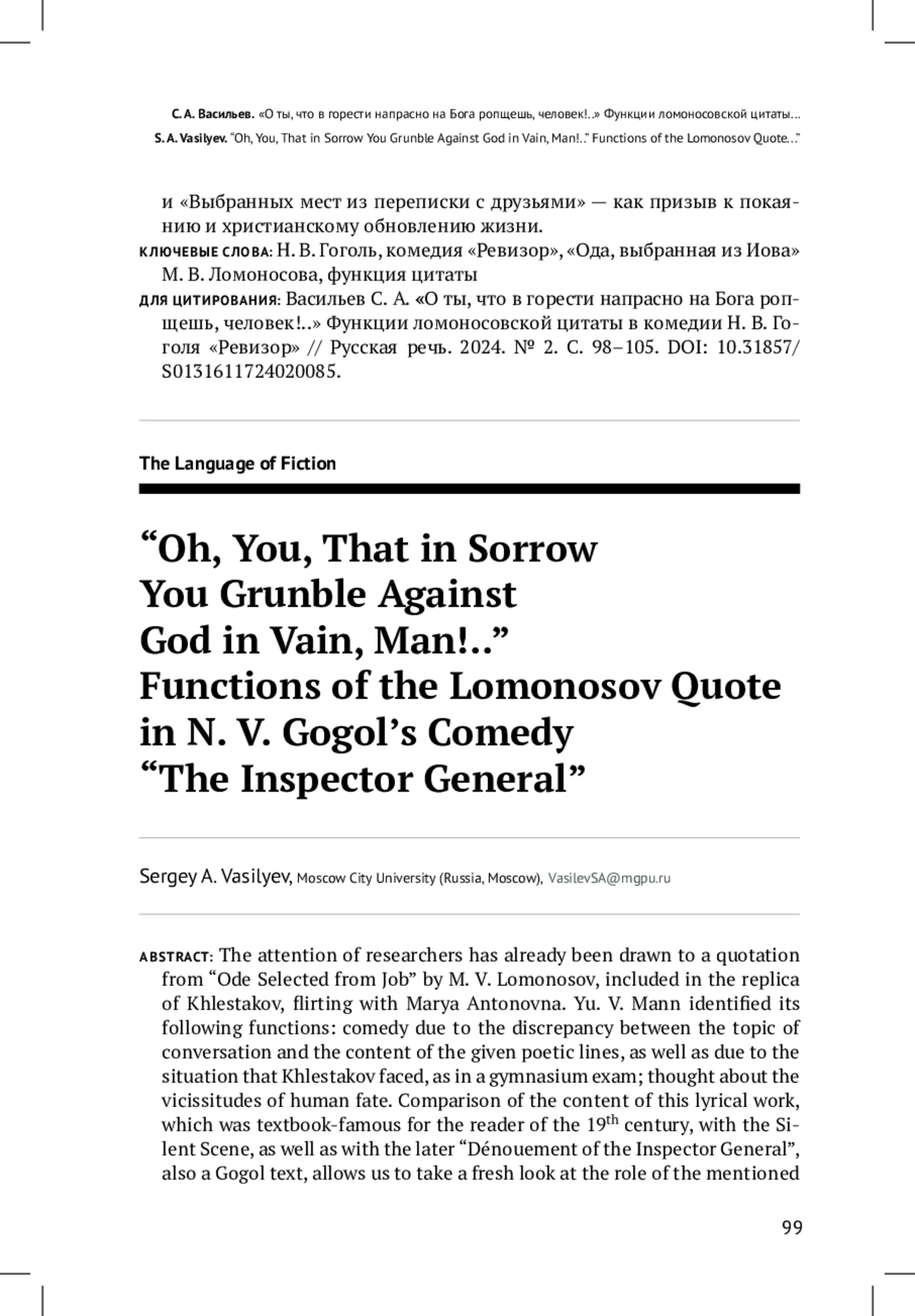 Внимание исследователей уже привлекала цитата из «Оды, выбранной из Иова» М. В. Ломоносова, включенная в реплику Хлестакова, флиртующего с Марьей Антоновной. Ю. В. Манном выявлены следующие ее функции: комизм из-за несоответствия темы разговора и содержания приведенных поэтических строк, а также из-за возник шего положения Хлестакова, как на экзамене в гимназии; мысль о превратностях человеческой судьбы. Сопоставление содержания данного лирического произведения, являвшегося для читателя XIX века хрестоматийно известным, с Немой сценой, а также с поздней «Развязкой “Ревизора”», тоже гоголевским текстом, позволяет по-новому взглянуть на роль упомянутой цитаты. Синтез искусств, аллюзивность, богатая символика Немой сцены, насыщенная аллегорическая образность «Развязки “Ревизора”» через ассоциативные связи с духовной одой М. В. Ломоносова усиливают эсхатологические и апокалиптические смысловые планы «Ревизора», акцентируют духовно-нравственную проблематику, формируют ее поэтапную постановку и углубление. «Ревизор» в этом аспекте вполне можно воспринимать уже не только как произведение сатирическое и социально-обличительное, но и — в контексте поздних «Размышлений о Божественной литургии» и «Выбранных мест из переписки с друзьями» — как призыв к покаянию и христианскому обновлению жизни