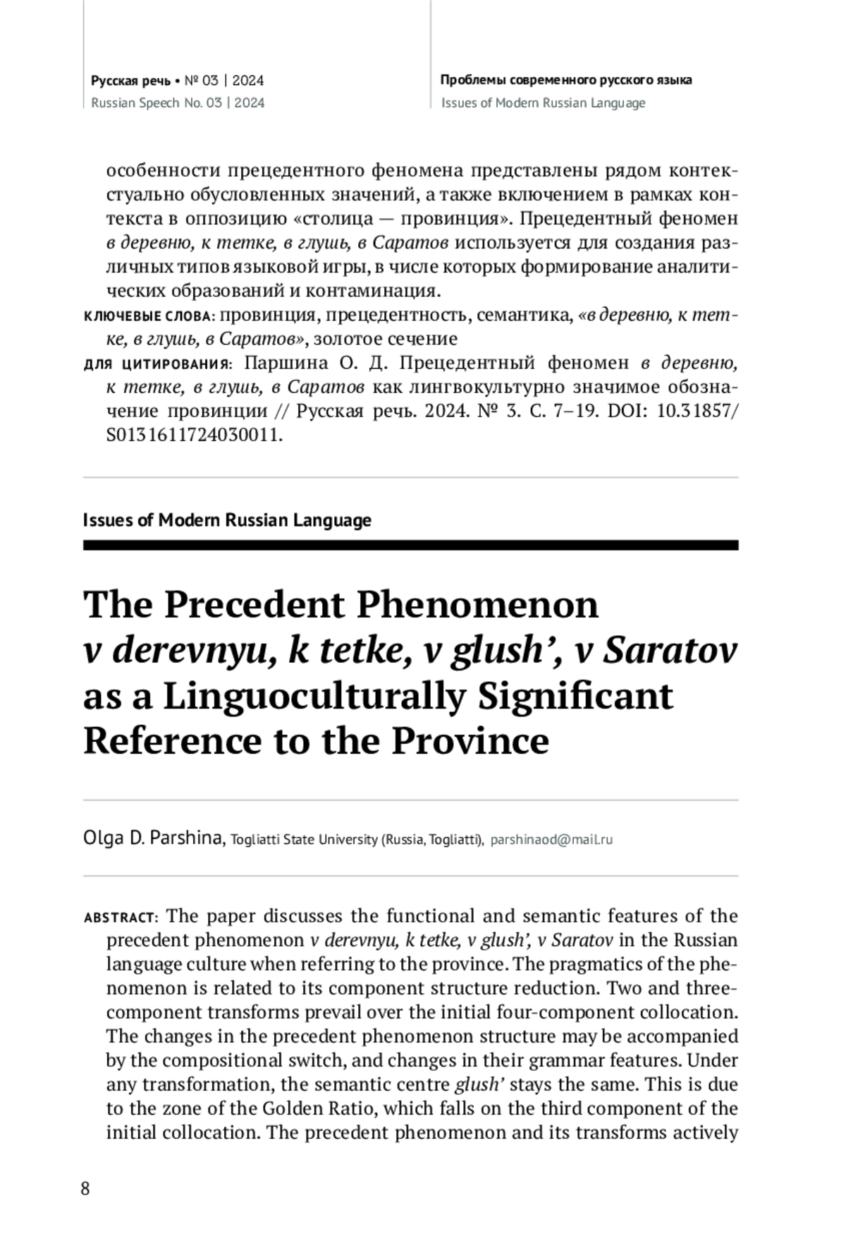 В статье рассматриваются функциональные и семантические особенности прецедентного феномена в деревню, к тетке, в глушь, в Саратов в русской лингвокультуре при обозначении провинции. Указанная цитата обычно употребляется в сокращенном виде. Дву- и трехкомпонентные трансформированные цитаты преобладают над исходным четырехкомпонентным сочетанием. Изменения структуры прецедентного феномена также могут сопровождаться перестановкой компонентов, заменой и изменением их грамматических характеристик. При любых трансформациях неизменным остается семантический центр глушь, что обусловлено зоной золотого сечения, которое приходится на третий компонент исходного сочетания. Прецедентный феномен и его трансформированные формы активно функционируют в сильных текстовых позициях заголовка, первого и последнего предложения текста или абзаца. В этом случае трехкомпонентные измененные цитаты подвергаются модальным преобразованиям в рамках вариативной интерпретации действительности. А двукомпонентные служат основой для проблемной сегментации, что дает возможность обозначить проблему и задать направление описания ситуации. Семантические особенности прецедентного феномена представлены рядом контекстуально обусловленных значений, а также включением в рамках контекста в оппозицию «столица — провинция». Прецедентный феномен в деревню, к тетке, в глушь, в Саратов используется для создания различных типов языковой игры, в числе которых формирование аналитических образований и контаминация