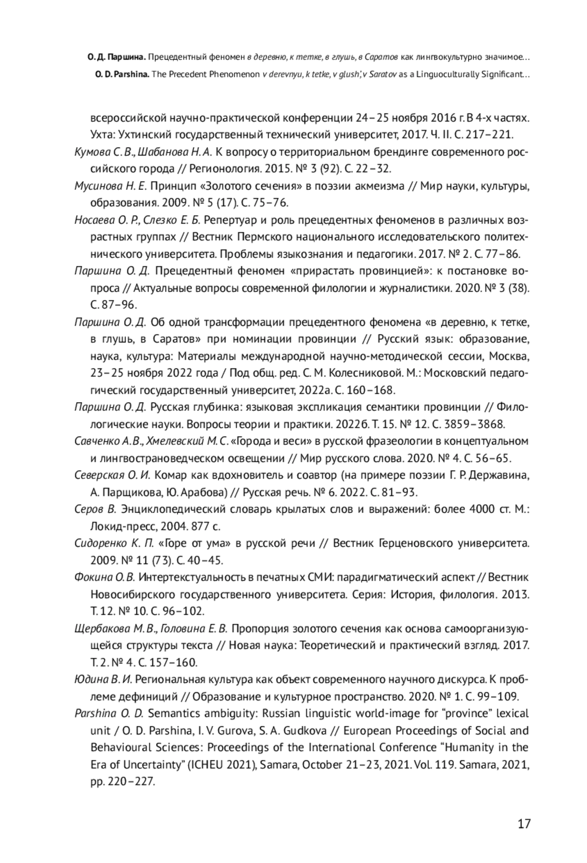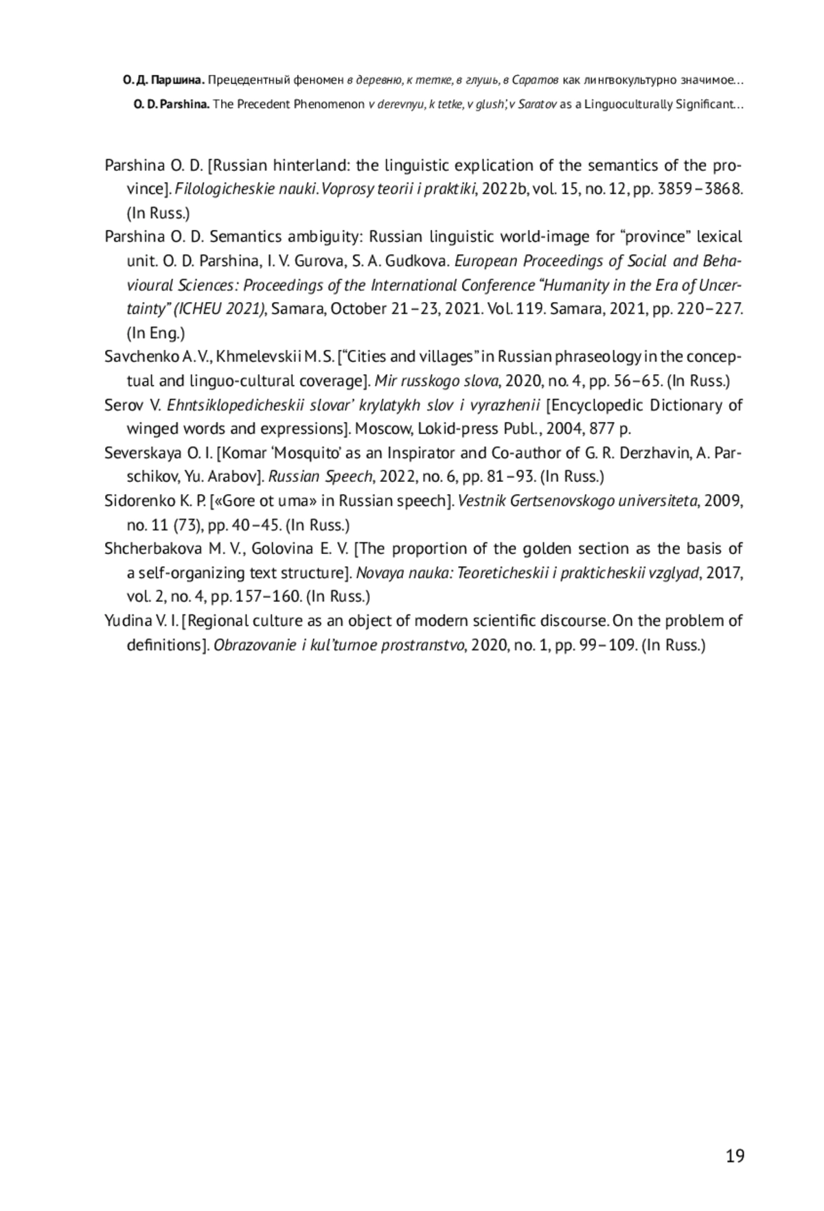 21. Parshina O. D. Semantics ambiguity: Russian linguistic world-image for “province” lexical unit / O. D. Parshina, I. V. Gurova, S. A. Gudkova // European Proceedings of Social and Behavioural Sciences: Proceedings of the International Conference “Humanity in the Era of Uncertainty” (ICHEU 2021), Samara, October 21-23, 2021. Vol. 119. Samara, 2021, pp. 220-227. EDN: MNKWNV