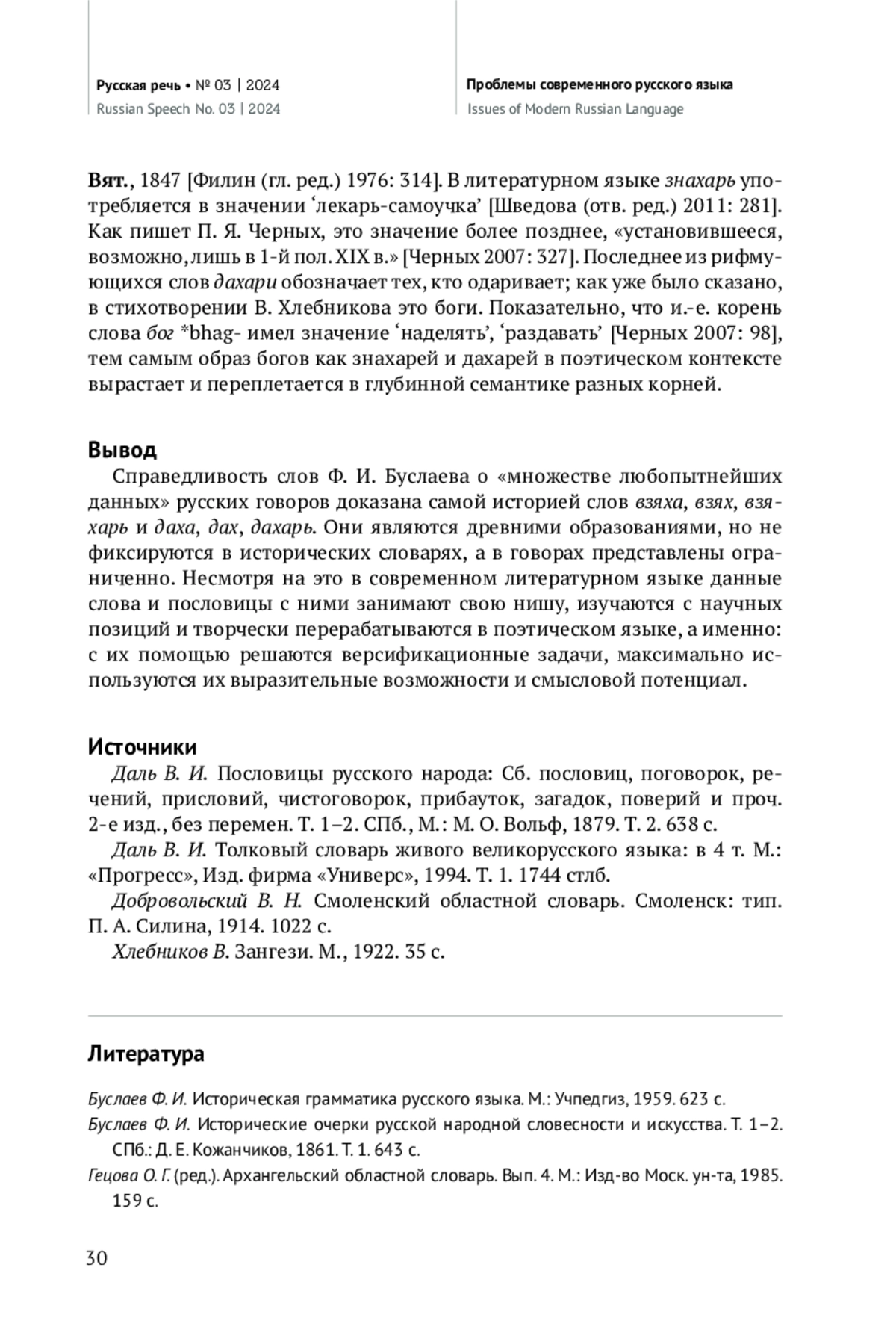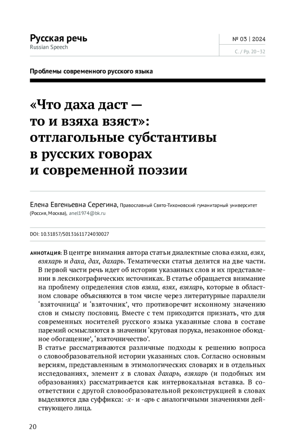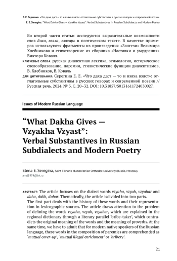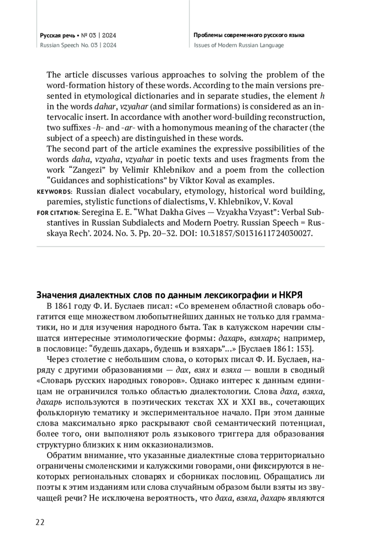 В центре внимания автора статьи диалектные слова взяха, взях, взяхарь и даха, дах, дахарь. Тематически статья делится на две части. В первой части речь идет об истории указанных слов и их представлении в лексикографических источниках. В статье обращается внимание на проблему определения слов взяха, взях, взяхарь, которые в областном словаре объясняются в том числе через литературные параллели ‘взяточница’ и ‘взяточник’, что противоречит исконному значению слов и смыслу пословиц. Вместе с тем приходится признать, что для современных носителей русского языка указанные слова в составе паремий осмысляются в значении ‘круговая порука, незаконное обоюдное обогащение’, ‘взяточничество’. В статье рассматриваются различные подходы к решению вопроса о словообразовательной истории указанных слов. Согласно основным версиям, представленным в этимологических словарях и в отдельных исследованиях, элемент х в словах дахарь, взяхарь (и подобных им образованиях) рассматривается как интервокальная вставка. В соответствии с другой словообразовательной реконструкцией в словах выделяются два суффикса: -х- и -арь с аналогичными значениями действующего лица. Во второй части статьи исследуются выразительные возможности слов даха, взяха, взяхарь в поэтическом тексте. В качестве примеров используются фрагменты из произведения «Зангези» Велимира Хлебникова и стихотворение из сборника «Наставки и умудрения» Виктора Коваля.