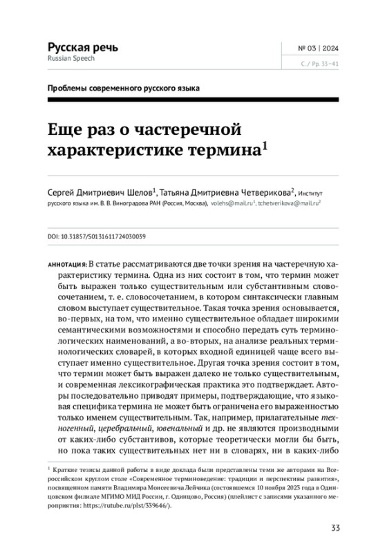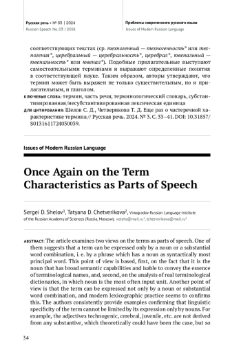 В статье рассматриваются две точки зрения на частеречную характеристику термина. Одна из них состоит в том, что термин может быть выражен только существительным или субстантивным словосочетанием, т. е. словосочетанием, в котором синтаксически главным словом выступает существительное. Такая точка зрения основывается, во-первых, на том, что именно существительное обладает широкими семантическими возможностями и способно передать суть терминологических наименований, а во-вторых, на анализе реальных терминологических словарей, в которых входной единицей чаще всего выступает именно существительное. Другая точка зрения состоит в том, что термин может быть выражен далеко не только существительным, и современная лексикографическая практика это подтверждает. Авторы последовательно приводят примеры, подтверждающие, что языковая специфика термина не может быть ограничена его выраженностью только именем существительным. Так, например, прилагательные техногенный, церебральный, ювенальный и др. не являются производными от каких-либо субстантивов, которые теоретически могли бы быть, но пока таких существительных нет ни в словарях, ни в каких-либо соответствующих текстах (ср. техногенный — техногенность* или техногения*, церебральный — церебральность*, церебрал*, ювенальный — ювенальность* или ювенал*). Подобные прилагательные выступают самостоятельными терминами и выражают определенные понятия в соответствующей науке. Таким образом, авторы утверждают, что термин может быть выражен не только существительным, но и прилагательным, и глаголом
