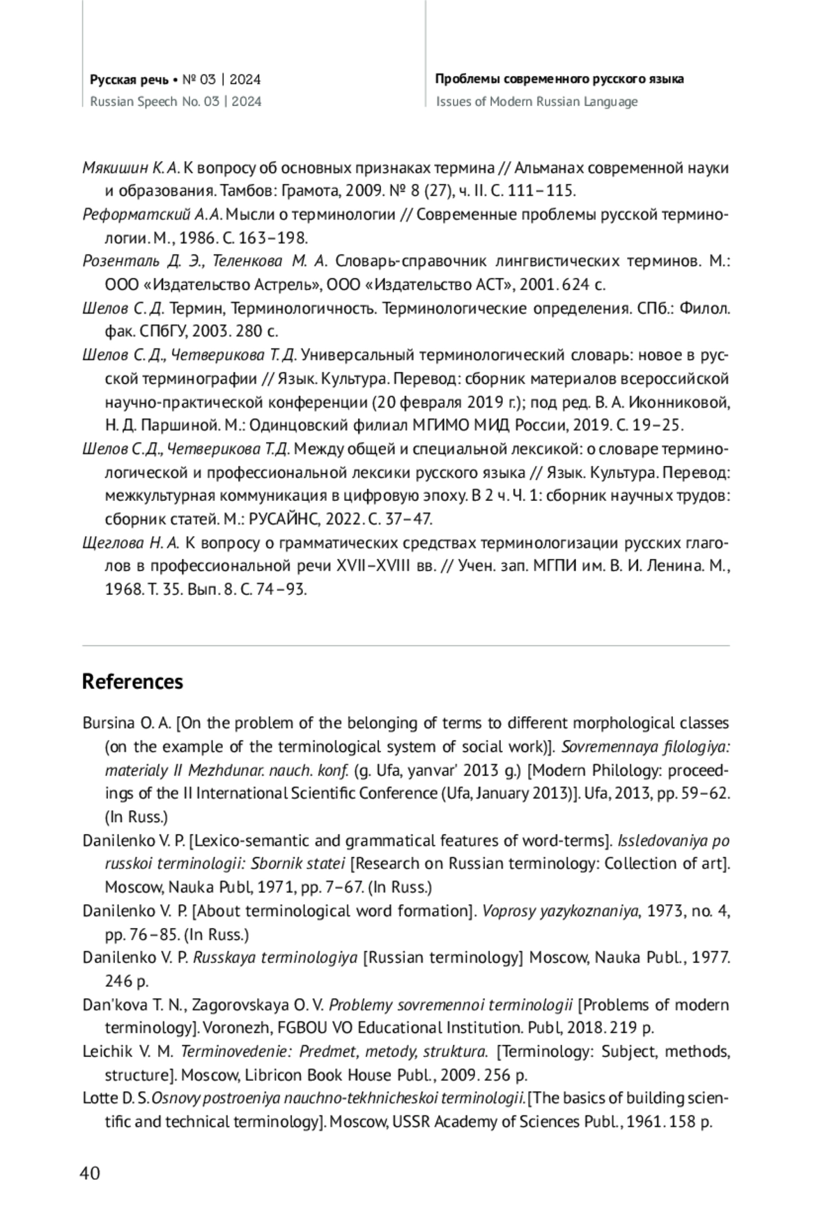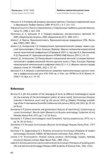 Shcheglova N. A. [On the question of grammatical means of terminologizing Russian verbs in professional speech of the XVII-XVIII centuries]. Uchen. zap. MGPI im. V. I. Lenina [Scienti c Journal of the Moscow State Pedagogical Institute named after V. I. Lenin]. Moscow, 1968. Vol. 35, iss. 8, pp. 74-93. (In Russ.).