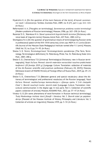 14. Шелов С. Д., Четверикова Т. Д. Между общей и специальной лексикой: о словаре терминологической и профессиональной лексики русского языка // Язык. Культура. Перевод: межкультурная коммуникация в цифровую эпоху. В 2 ч. Ч. 1: сборник научных трудов: сборник статей. М.: РУСАЙНС, 2022. С. 37-47. EDN: SGNPXN
