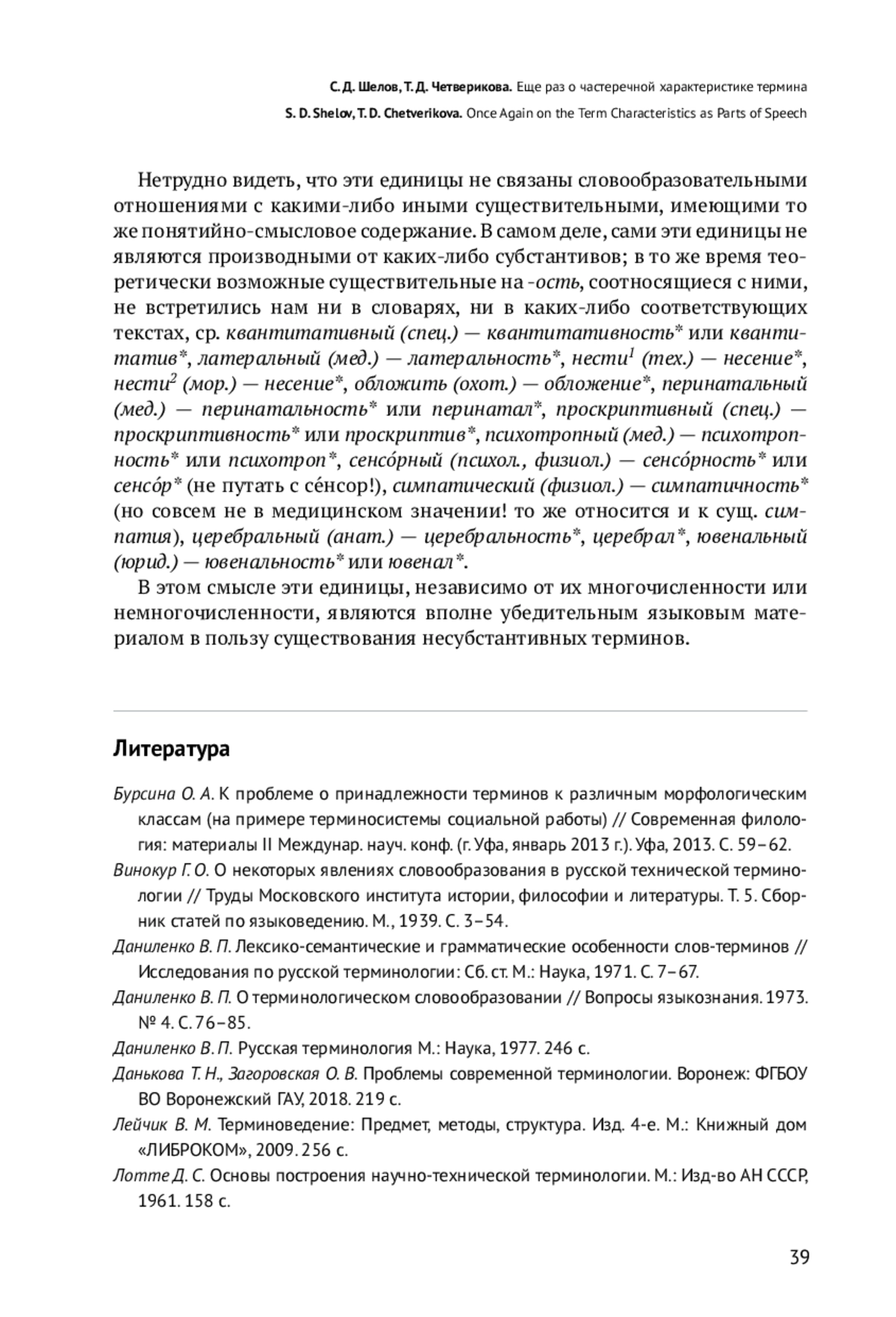 Shelov S. D. Termin, Terminologichnost’. Terminologicheskie opredeleniya. [The Term, Terminology. Terminological de nitions]. St. Petersburg, Philol. Fac. St. Petersburg State Univ. Publ., 2003. 280 p.