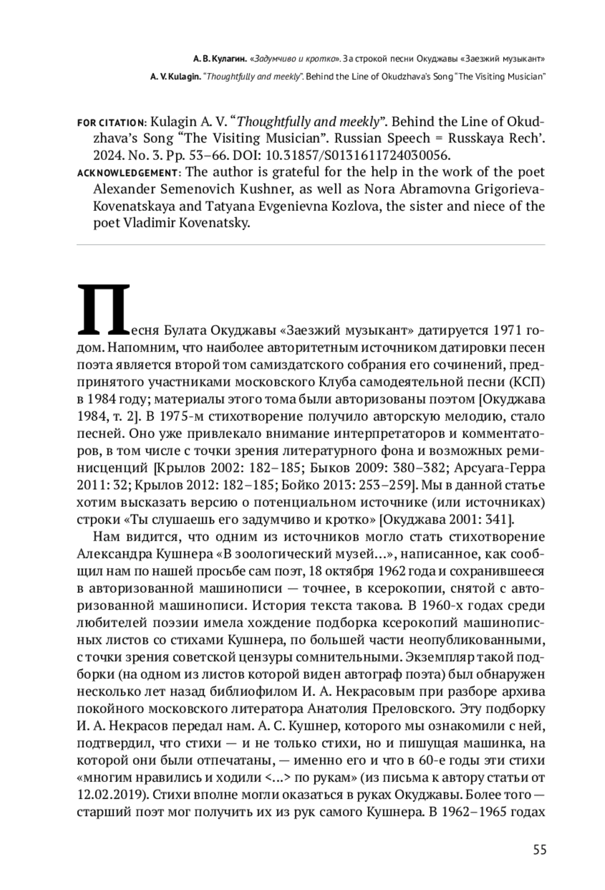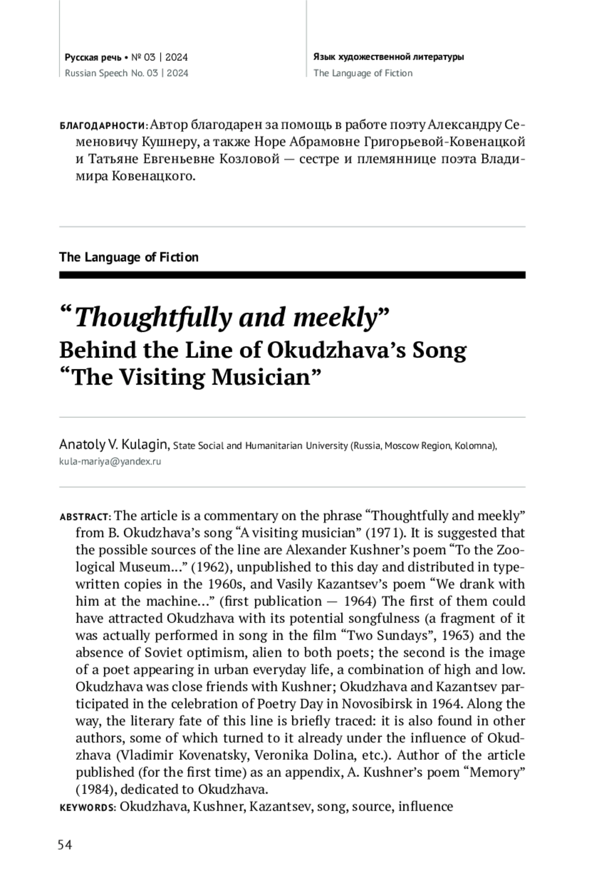 Kushner A. S. Neskol’ko slov o Bulate [A few words about Bulat]. Tvorchestvo Bulata Okudzhavy v kontekste kul’tury ХХ veka. Red.-sost.: I. I. Rishina [The work of Bulat Okudzhava in the context of the culture of the twentieth century. Edited by: I. I. Rishina]. Moscow, Sol’ Publ., 2001, pp. 70-72. (In Russ.).