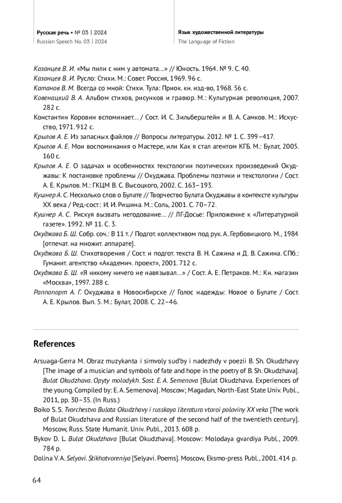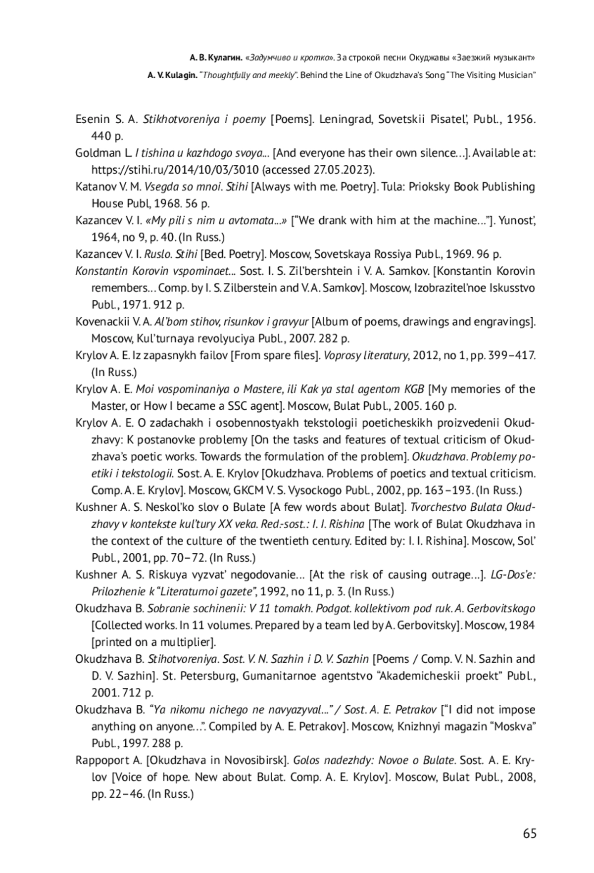 Krylov A. E. O zadachakh i osobennostyakh tekstologii poeticheskikh proizvedenii Okudzhavy: K postanovke problemy [On the tasks and features of textual criticism of Okudzhava’s poetic works. Towards the formulation of the problem]. Okudzhava. Problemy poetiki i tekstologii. Sost. A. E. Krylov [Okudzhava. Problems of poetics and textual criticism. Comp. A. E. Krylov]. Moscow, GKCM V. S. Vysockogo Publ., 2002, pp. 163-193. (In Russ.).