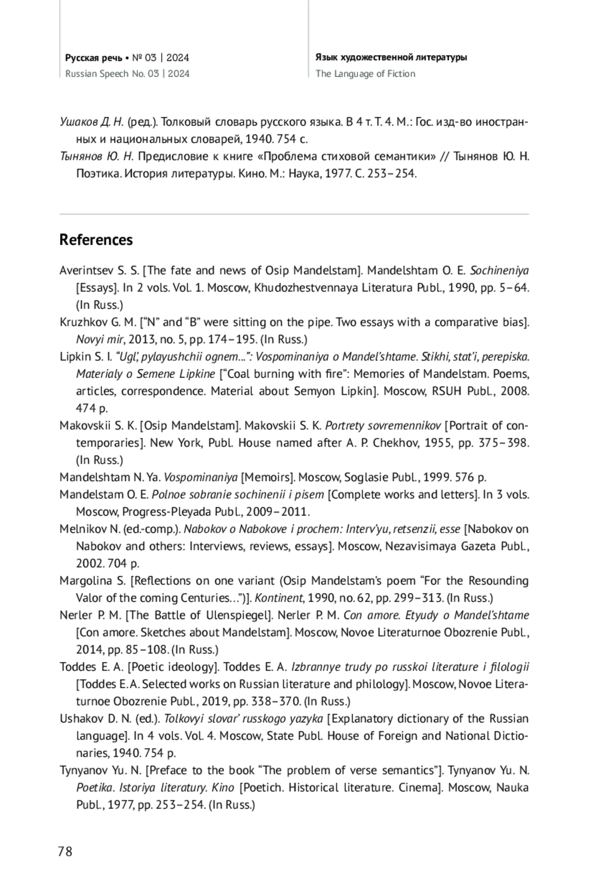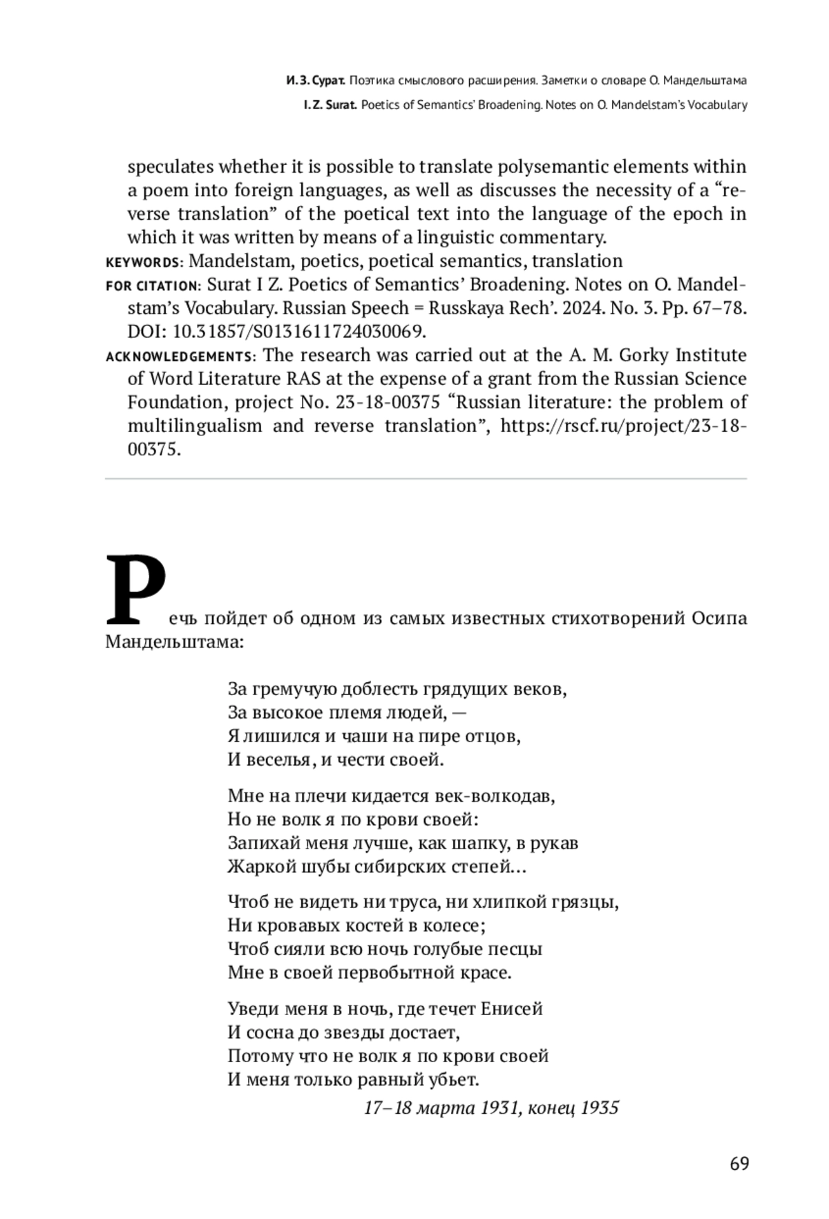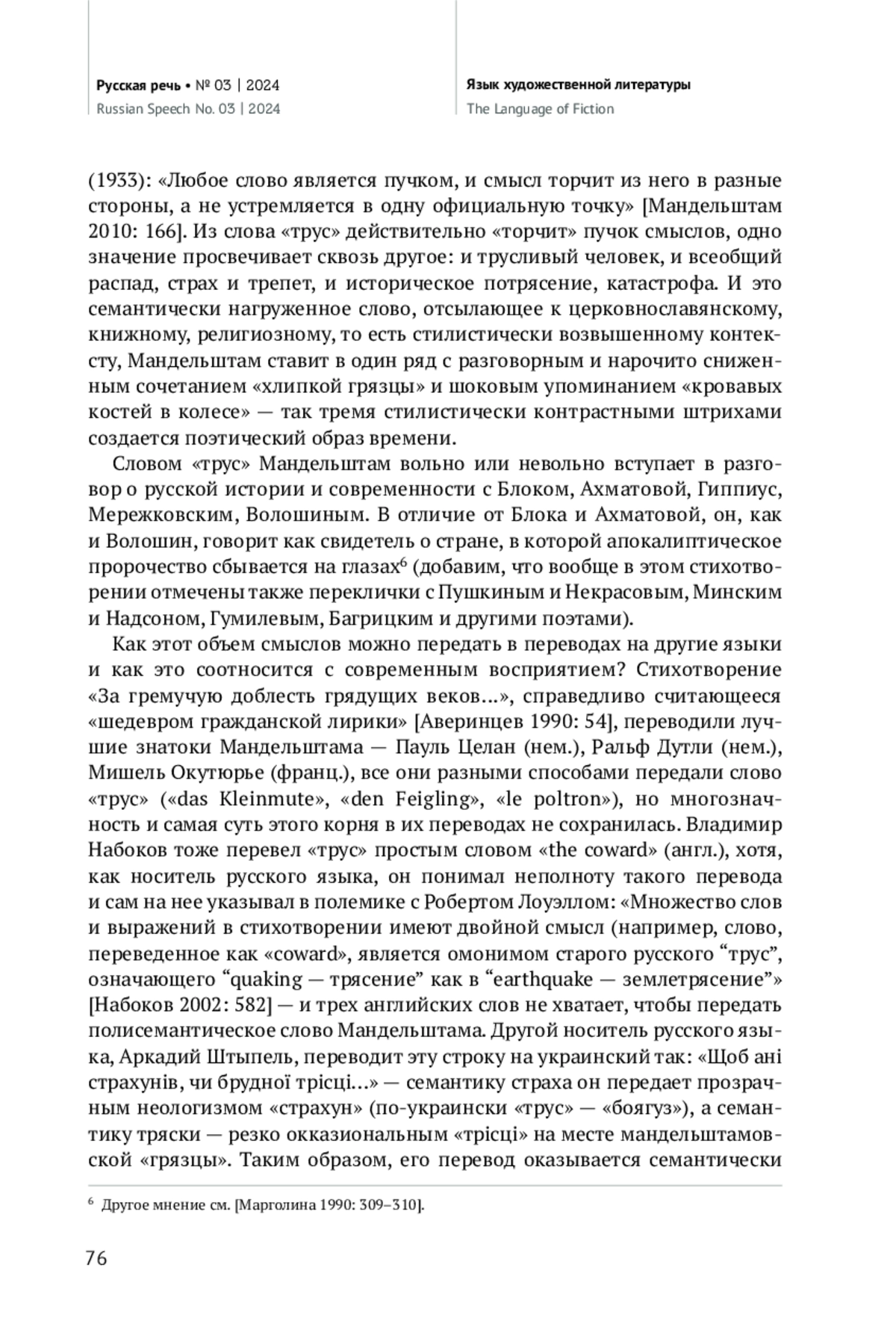 Margolina S. [Re ections on one variant (Osip Mandelstam’s poem “For the Resounding Valor of the coming Centuries..”.)]. Kontinent, 1990, no. 62, pp. 299-313. (In Russ.).