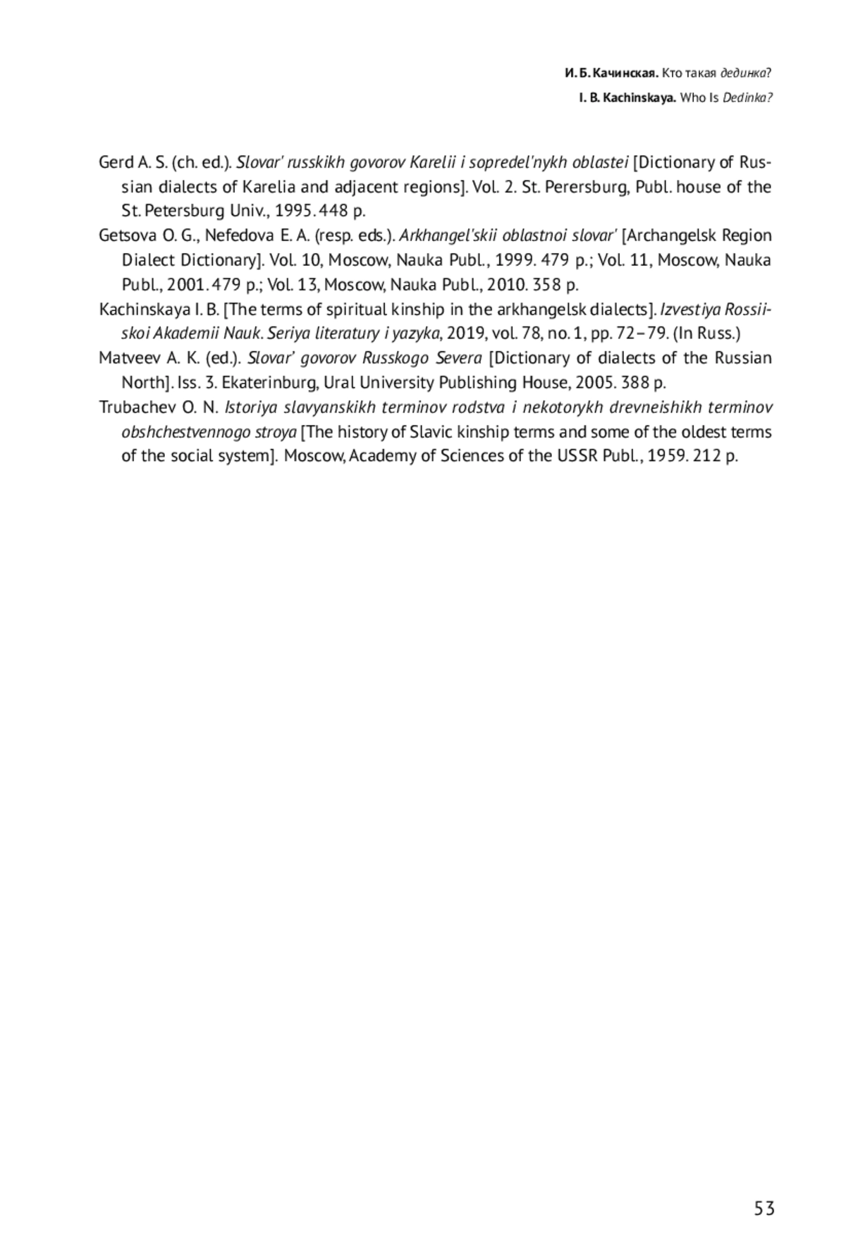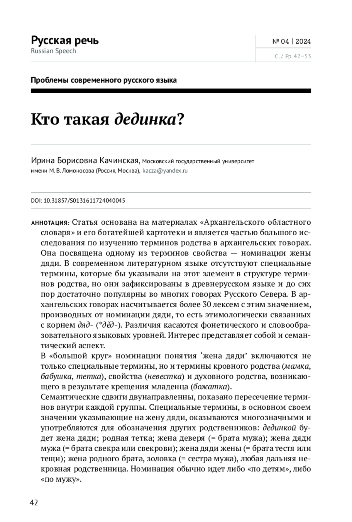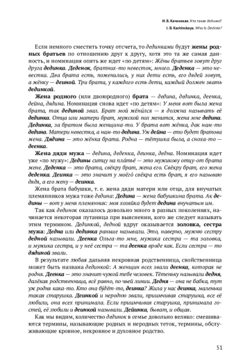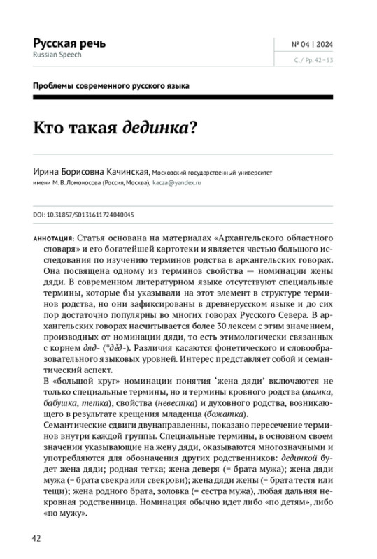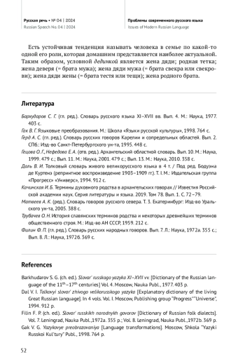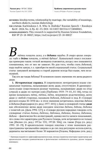 Статья основана на материалах «Архангельского областного словаря» и его богатейшей картотеки и является частью большого исследования по изучению терминов родства в архангельских говорах. Она посвящена одному из терминов свойства — номинации жены дяди. В современном литературном языке отсутствуют специальные термины, которые бы указывали на этот элемент в структуре терминов родства, но они зафиксированы в древнерусском языке и до сих пор достаточно популярны во многих говорах Русского Севера. В архангельских говорах насчитывается более 30 лексем с этим значением, производных от номинации дяди, то есть этимологически связанных с корнем дяд- (*дěд-). Различия касаются фонетического и словообразовательного языковых уровней. Интерес представляет собой и семантический аспект. В «большой круг» номинации понятия ‘жена дядиʼ включаются не только специальные термины, но и термины кровного родства (мамка, бабушка, тетка), свойства (невестка) и духовного родства, возникающего в результате крещения младенца (божатка). Семантические сдвиги двунаправленны, показано пересечение терминов внутри каждой группы. Специальные термины, в основном своем значении указывающие на жену дяди, оказываются многозначными и употребляются для обозначения других родственников: дединкой будет жена дяди; родная тетка; жена деверя (= брата мужа); жена дяди мужа (= брата свекра или свекрови); жена дяди жены (= брата тестя или тещи); жена родного брата, золовка (= сестра мужа), любая дальняя некровная родственница. Номинация обычно идет либо «по детям», либо «по мужу»