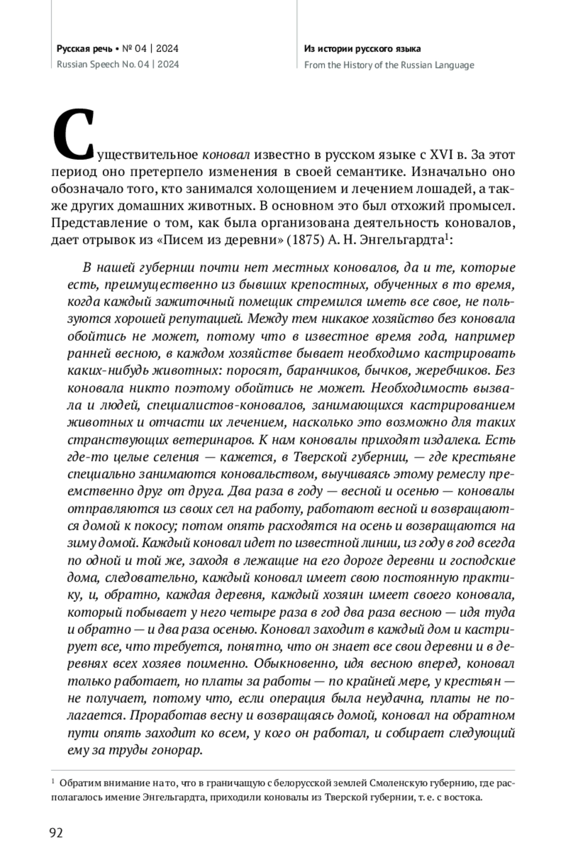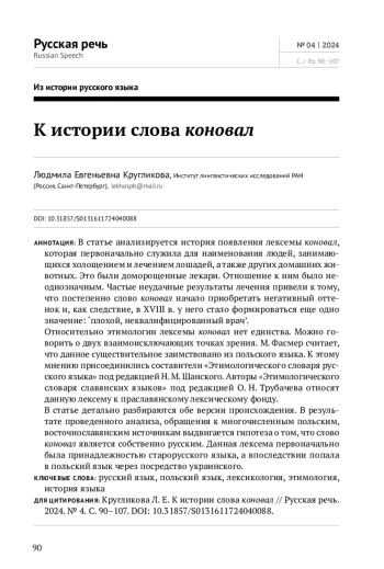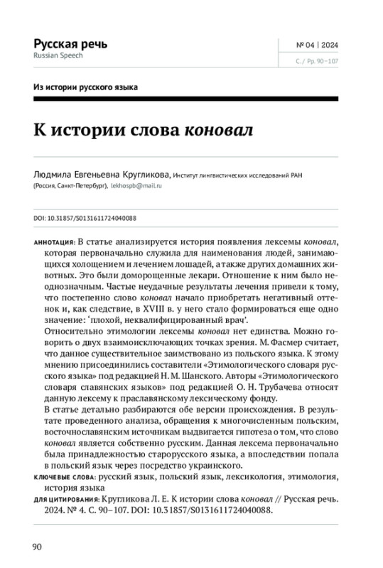 В статье анализируется история появления лексемы коновал, которая первоначально служила для наименования людей, занимающихся холощением и лечением лошадей, а также других домашних животных. Это были доморощенные лекари. Отношение к ним было неоднозначным. Частые неудачные результаты лечения привели к тому, что постепенно слово коновал начало приобретать негативный оттенок и, как следствие, в XVIII в. у него стало формироваться еще одно значение: ‘плохой, неквалифицированный врач’. Относительно этимологии лексемы коновал нет единства. Можно говорить о двух взаимоисключающих точках зрения. М. Фасмер считает, что данное существительное заимствовано из польского языка. К этому мнению присоединились составители «Этимологического словаря русского языка» под редакцией Н. М. Шанского. Авторы «Этимологического словаря славянских языков» под редакцией О. Н. Трубачева относят данную лексему к праславянскому лексическому фонду. В статье детально разбираются обе версии происхождения. В результате проведенного анализа, обращения к многочисленным польским, восточнославянским источникам выдвигается гипотеза о том, что слово коновал является собственно русским. Данная лексема первоначально была принадлежностью старорусского языка, а впоследствии попала в польский язык через посредство украинского