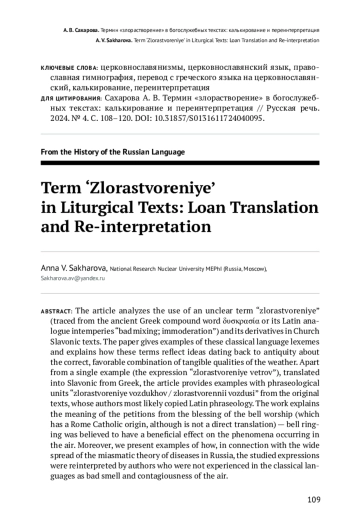 Интеллектуальное наследие античности оставалось базой средневековой христианской культуры, когда многие ее термины использовались и авторами литургических текстов. Однако для славянского читателя могли быть непонятны такие античные термины, причем не только заимствованные, но и калькированные. Цель данной работы — дать подробный историко-культурный комментарий к непонятному редкому слову злорастворение и его производным, присутствующим в богослужебных текстах, но отсутствующим в исторических словарях (для термина благорастворение такая работа уже была проделана в статье [Сахарова 2022], и настоящее исследование отчасти является ее продолжением).