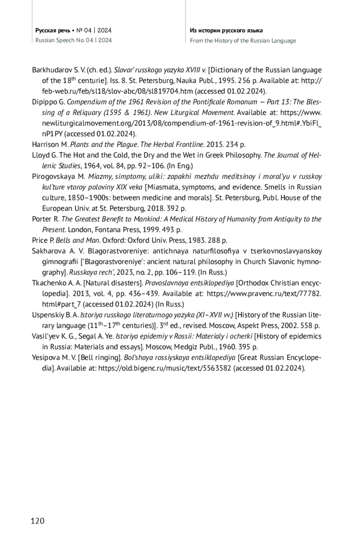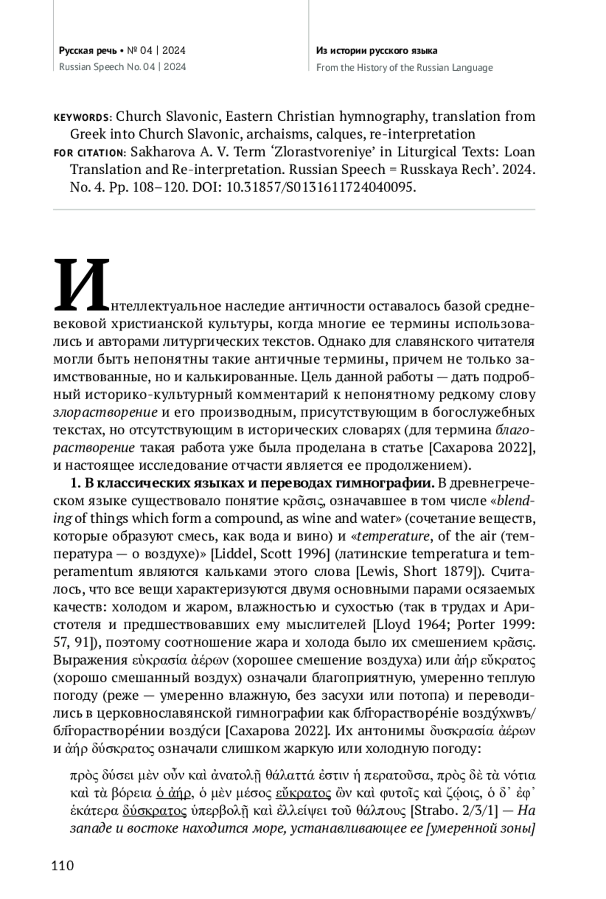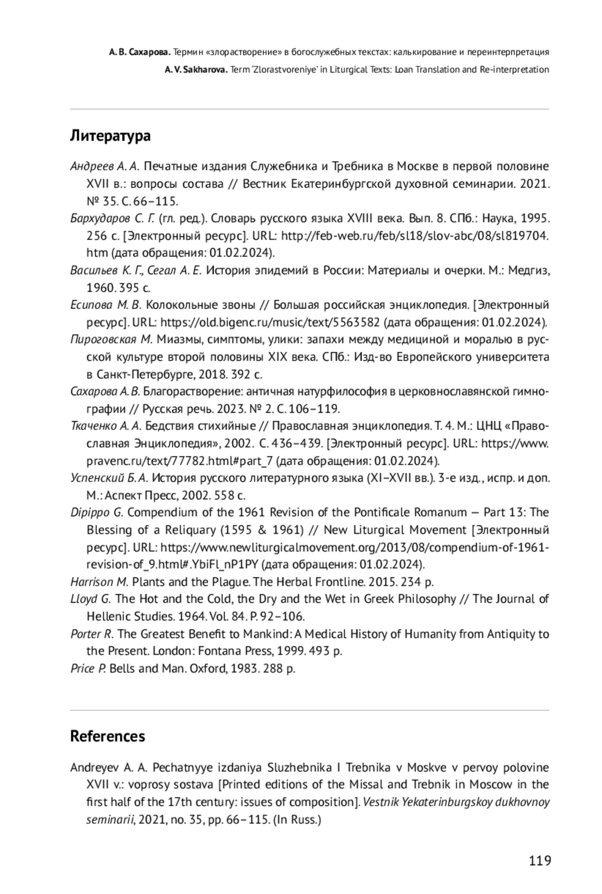 33. Сахарова А. В. Благорастворение: античная натурфилософия в церковнославянской гимнографии // Русская речь. 2023. № 2. С. 106-119. EDN: XNXDKQ