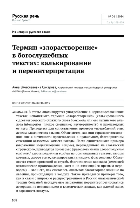 В статье анализируется употребление в церковнославянских текстах непонятного термина «злорастворение» (калькированного с древнегреческого сложного слова δυσκρασία или его латинского аналога intemperies ‘плохое смешение; неумеренность’) и производных от него. Приводятся для сопоставления примеры употреблений этих лексем классических языков. Объясняется, как они отражают восходящие еще к античности представления о правильном, благоприятном сочетании осязаемых качеств погоды. После единственного примера (выражения злорастворение ветров), переведенного на славянский с греческого, приводятся примеры c фразеологизмами злорастворение воздухов / злораствореннии воздуси из оригинальных текстов, авторы которых, скорее всего, калькировали латинскую фразеологию. Объясняется смысл прошений из службы благословения колокола (имеющей католическое происхождение, хотя и не являющейся прямым переводом) — звон его, как считалось, оказывал благотворное влияние на явления, происходящие в воздухе. Также приводятся примеры того, как в связи с широким распространением в России миазматической теории болезней исследуемые выражения переинтерпретировались авторами, не искушенными в классических языках, как плохой запах и заразность воздуха.