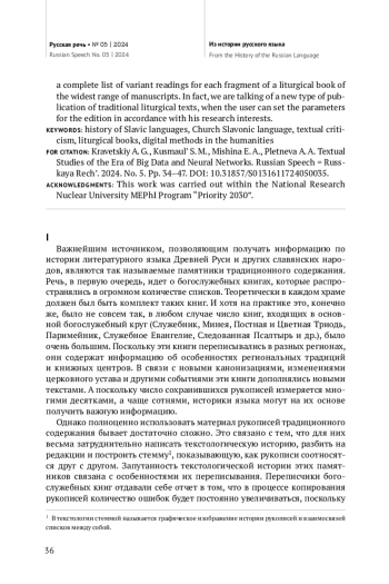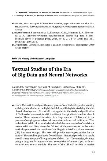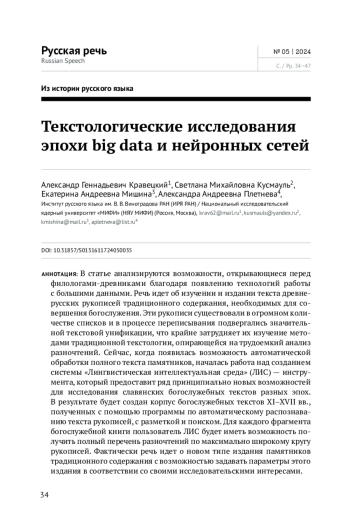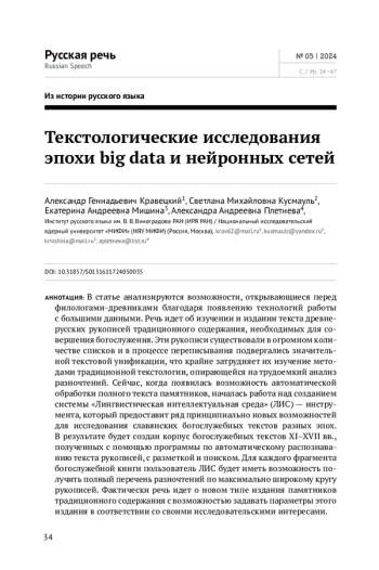 В статье анализируются возможности, открывающиеся перед филологами-древниками благодаря появлению технологий работы с большими данными. Речь идет об изучении и издании текста древнерусских рукописей традиционного содержания, необходимых для совершения богослужения. Эти рукописи существовали в огромном количестве списков и в процессе переписывания подвергались значительной текстовой унификации, что крайне затрудняет их изучение методами традиционной текстологии, опирающейся на трудоемкий анализ разночтений. Сейчас, когда появилась возможность автоматической обработки полного текста памятников, началась работа над созданием системы «Лингвистическая интеллектуальная среда» (ЛИС) — инструмента, который предоставит ряд принципиально новых возможностей для исследования славянских богослужебных текстов разных эпох. В результате будет создан корпус богослужебных текстов XI–XVII вв., полученных с помощью программы по автоматическому распознаванию текста рукописей, с разметкой и поиском. Для каждого фрагмента богослужебной книги пользователь ЛИС будет иметь возможность получить полный перечень разночтений по максимально широкому кругу рукописей. Фактически речь идет о новом типе издания памятников традиционного содержания с возможностью задавать параметры этого издания в соответствии со своими исследовательскими интересами