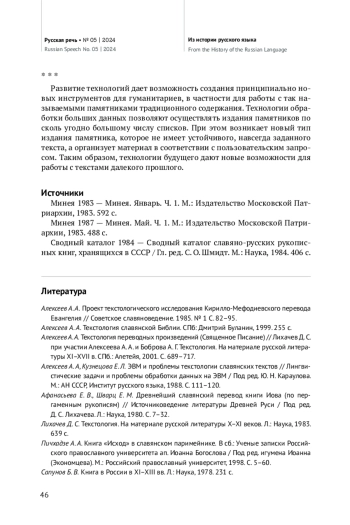 Alekseev A. A., Kuznetsova E. L. [Computers and Problems of Text History of Slavic texts]. Lingvisticheskie zadachi i problemy obrabotki dannykh na EVM [Linguistic problems and problems of data processing on computers]. Ed. by Yu. N. Karaulov. Moscow, AS USSR Publ., 1988, pp. 111-120. (In Russ.).