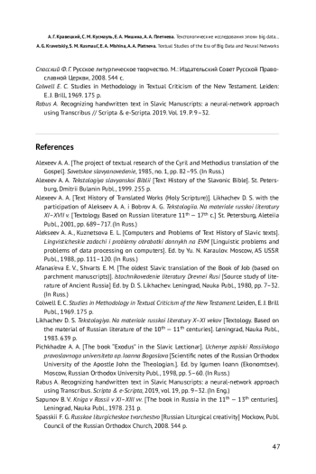 7. Алексеев А. А, Кузнецова Е. Л. ЭВМ и проблемы текстологии славянских текстов // Лингвистические задачи и проблемы обработки данных на ЭВМ / Под ред. Ю. Н. Караулова. М.: АН СССР, Институт русского языка, 1988. С. 111-120.