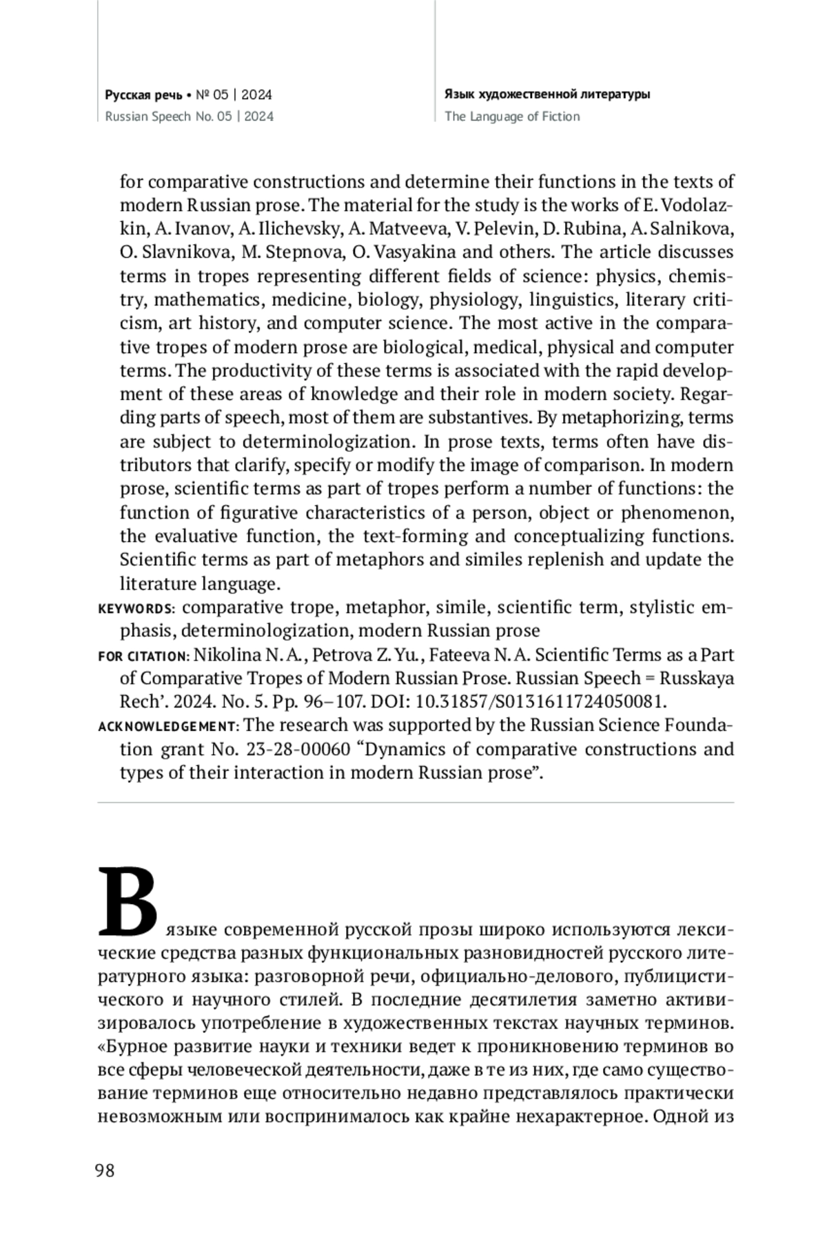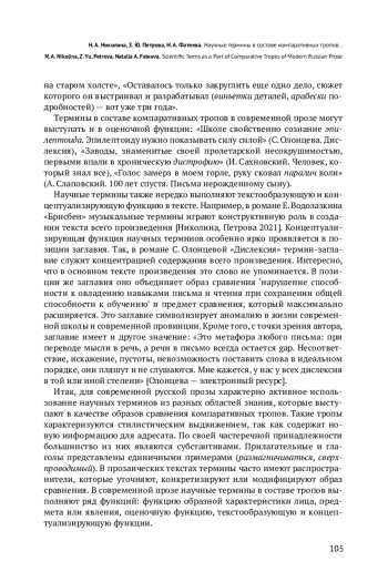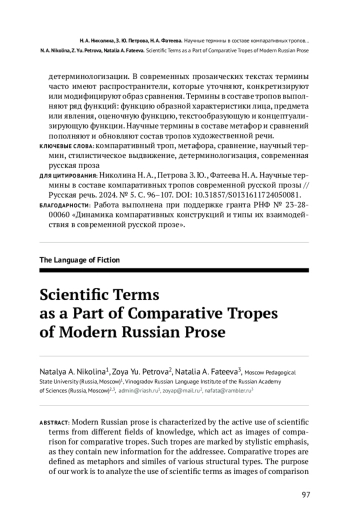 Для современной русской прозы характерно активное использование научных терминов из разных областей знания. Эти термины выступают в качестве образов сравнения компаративных тропов, которые отмечены стилистическим выдвижением, так как содержат новую информацию для адресата. Под компаративными тропами понимаются метафоры и сравнения разных структурных типов. Цель нашей работы — проанализировать использование научных терминов в составе компаративных конструкций и определить их функции в текстах современной русской прозы. Материалом для исследования служат произведения Е. Водолазкина, А. Иванова, А. Иличевского, А. Матвеевой, В. Пелевина, Д. Рубиной, А. Сальникова, О. Славниковой, М. Степновой, О. Васякиной и др. В статье рассматриваются термины, представляющие разные области науки: физики, химии, математики, медицины, биологии, физиологии, лингвистики, литературоведения, искусствознания, информатики. Наиболее активны в компаративных тропах современной прозы биологические, медицинские, физические и компьютерные термины. Их продуктивность связана с бурным развитием этих областей знания и их ролью в современном обществе. По своей частеречной принадлежности большинство из них являются субстантивами. Термины в составе компаративных тропов подвергаются детерминологизации. В современных прозаических текстах термины часто имеют распространители, которые уточняют, конкретизируют или модифицируют образ сравнения. Термины в составе тропов выполняют ряд функций: функцию образной характеристики лица, предмета или явления, оценочную функцию, текстообразующую и концептуализирующую функции. Научные термины в составе метафор и сравнений пополняют и обновляют состав тропов художественной речи.