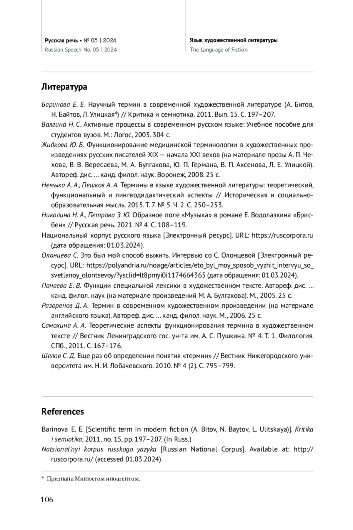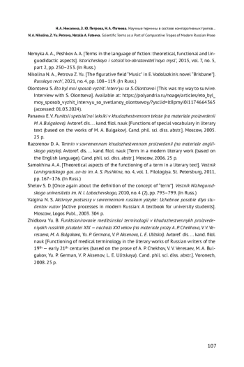 1. Баринова Е. Е. Научный термин в современной художественной литературе (А. Битов, Н. Байтов, Л. Улицкая) // Критика и семиотика. 2011. Вып. 15. С. 197-207.