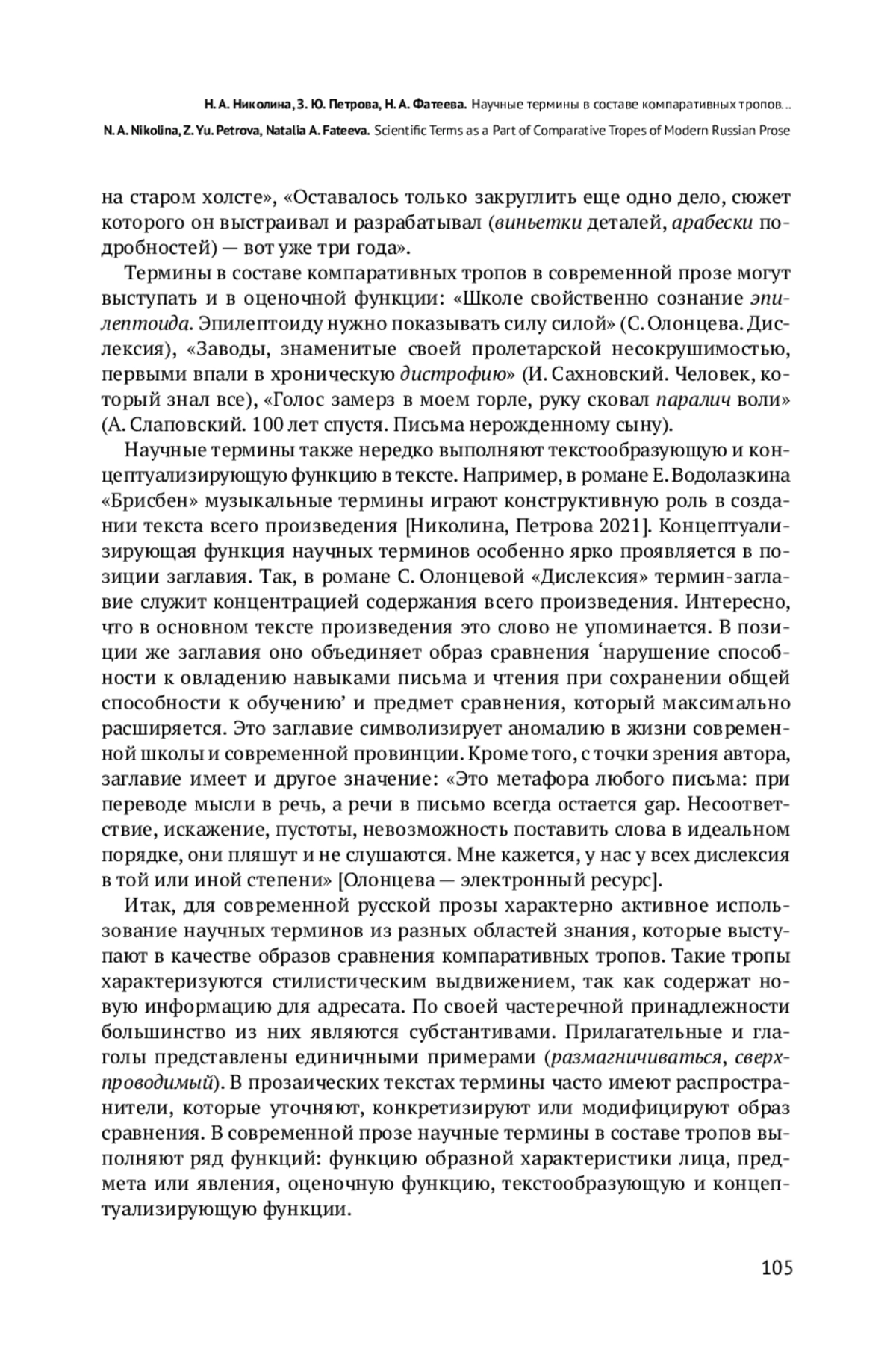 5. Николина Н. А., Петрова З. Ю. Образное поле “Музыка” в романе Е. Водолазкина “Брисбен” // Русская речь. 2021. № 4. С. 108-119. EDN: RSSJXE