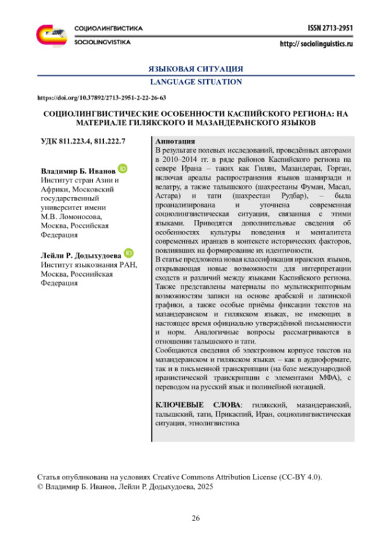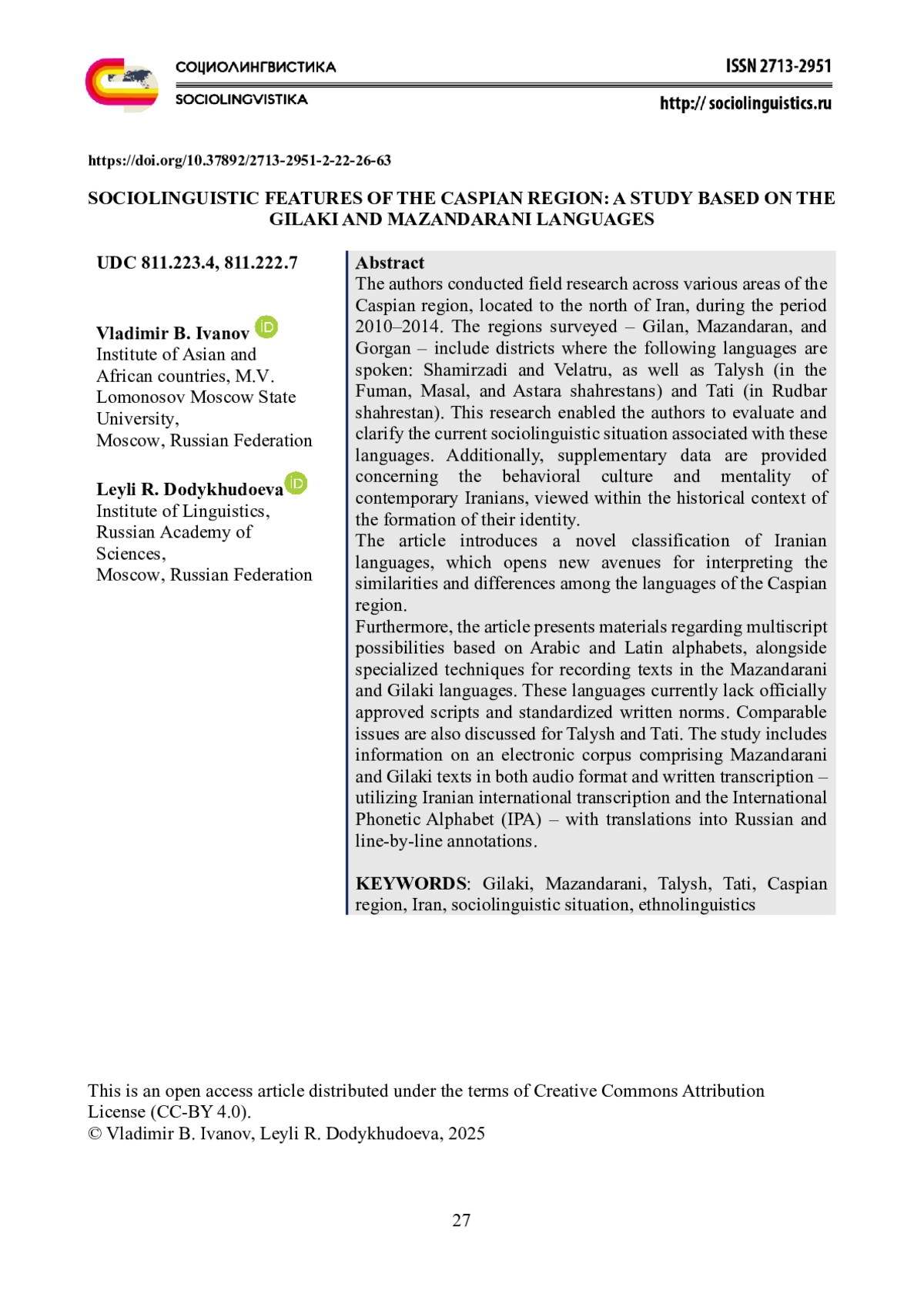 26. Иванов В.Б., Додыхудоева Л.Р. (2021) ViZegihA-ye zabAnSenAsi-o farhangi-ye gilaki o mAzandarAni [Лингвострановедческие особенности гилякского и мазандеранского языков], PaZuheShA-yi darbAre-ye karAnehA-ye daryA-ye kAspyen (Исследования прибрежного ареала Каспийского моря). Тегеран, PeZvAk-e Farzan. Т. 4. С. 4.