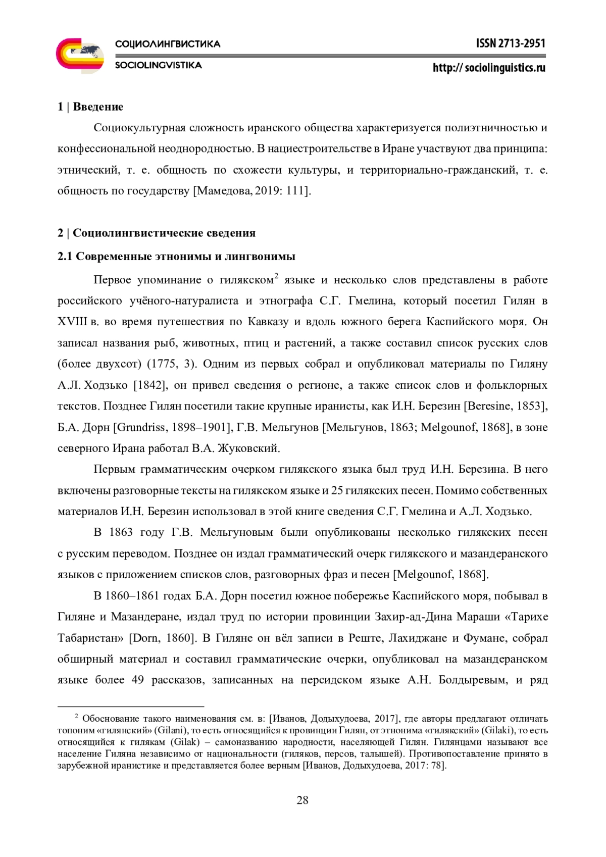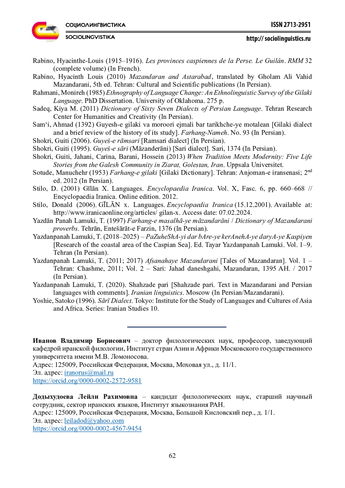 25. Иванов В.Б., Додыхудоева Л.Р. (2020) Социо- и этнолингвистические особенности гилякского и мазандеранского языков, Труды Института востоковедения РАН. № 27. Проблемы общей и востоковедной лингвистики. Языки Азии и Африки, Отв. ред. А.И. Коган, ред.-сост. А.С. Панина. М., Институт востоковедения РАН. С. 42-55.