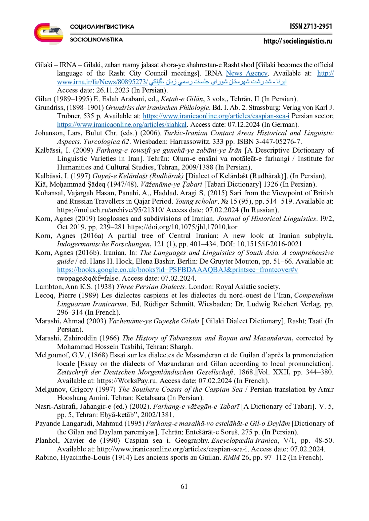 126. Stilo D. (2001) Gīlān X. Languages. Encyclopaedia Iranica. Vol. X, Fasc. 6, pp. 660-668.
