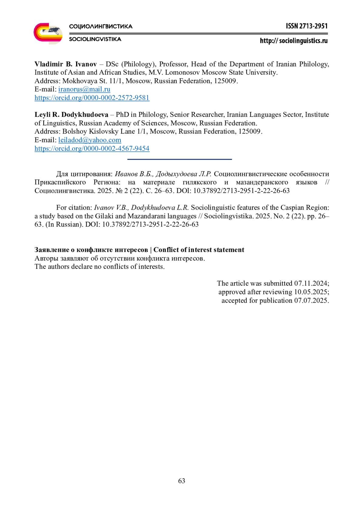 23. Иванов В.Б., Додыхудоева Л.Р. (2017) Синтаксические отношения имён в северо-западных иранских языках (на мазандеранском и гилякском материале), Вопросы языкознания. № 2. С. 77-95. EDN: YJKKCJ