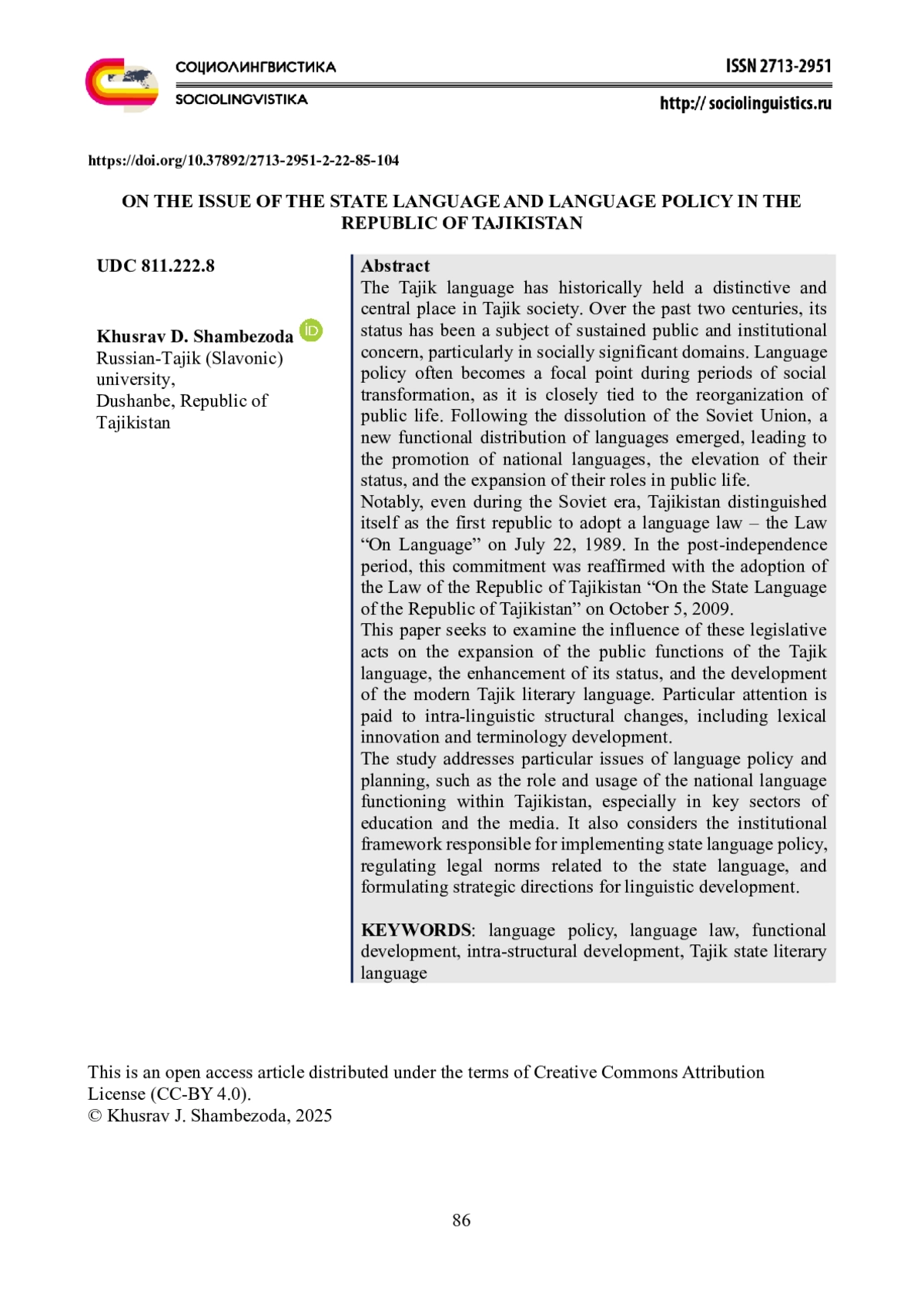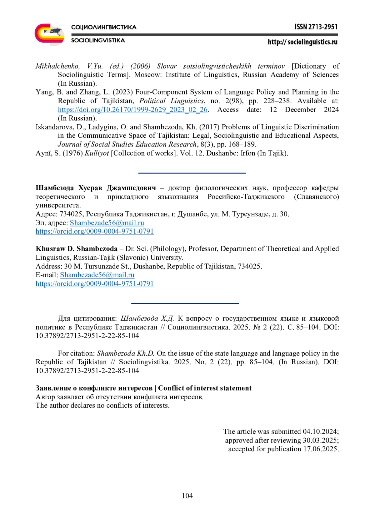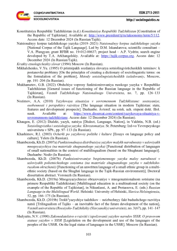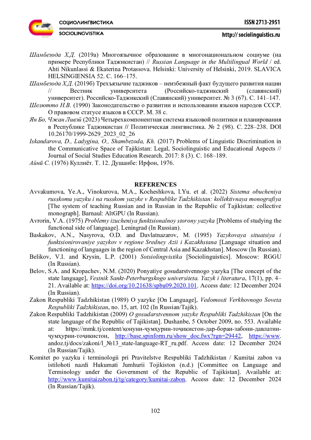 23. Iskandarova, D., Ladygina, O., Shambezoda, Kh. 2017 Problems of Linguistic Discrimination in the Communicative Space of Tajikistan, Legal, Sociolinguistic and Educational Aspects, Journal of Social Studies Education Research. 2017, 8 3. С. 168-189. EDN: XXGMNF