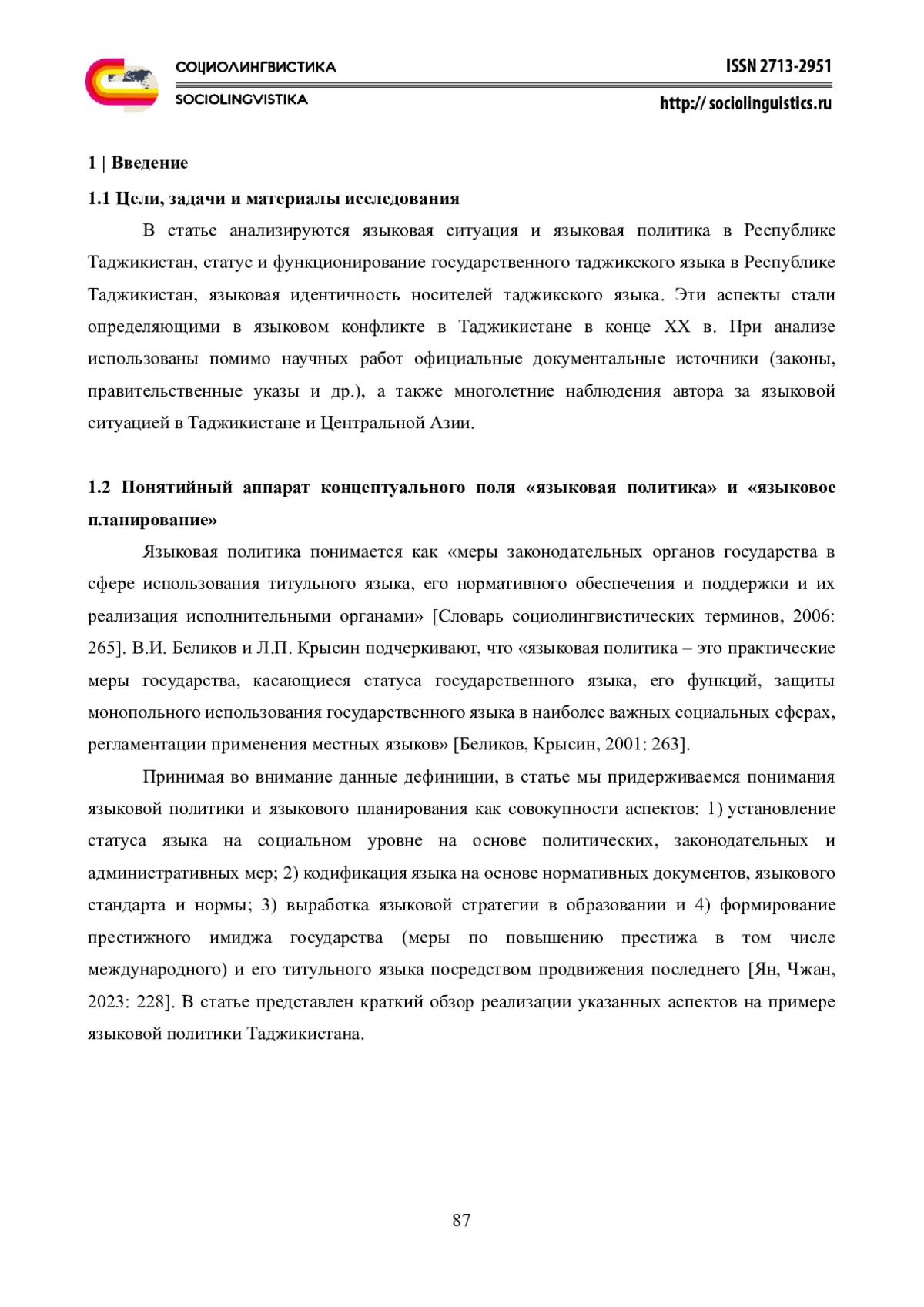 22. Ян Бо, Чжан Ливэй 2023 Четырехкомпонентная система языковой политики и планирования в Республике Таджикистан, Политическая лингвистика. № 2 98. С. 228-238.