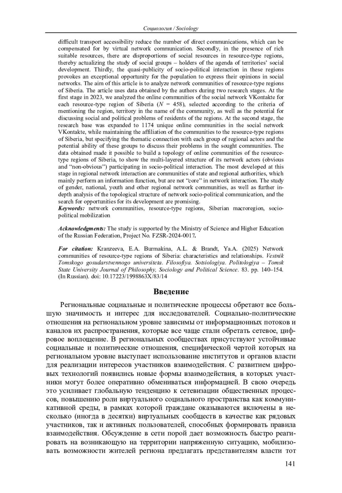 Рассматриваются сетевые сообщества регионов ресурсного типа Сибири, являющиеся пространством сетевого взаимодействия между основными акторами региональной коммуникации. По результатам анализа сетевых сообществ на двух исследовательских этапах (2023 г., N = 458; 2024 г., N = 1 174) показана топологическая структура сети. Выявлена многослойность структуры сетевых акторов, принимающих участие в социально-политическом взаимодействии, отмечены перспективы изучения региональных сообществ. Авторы заявляют об отсутствии конфликта интересов.