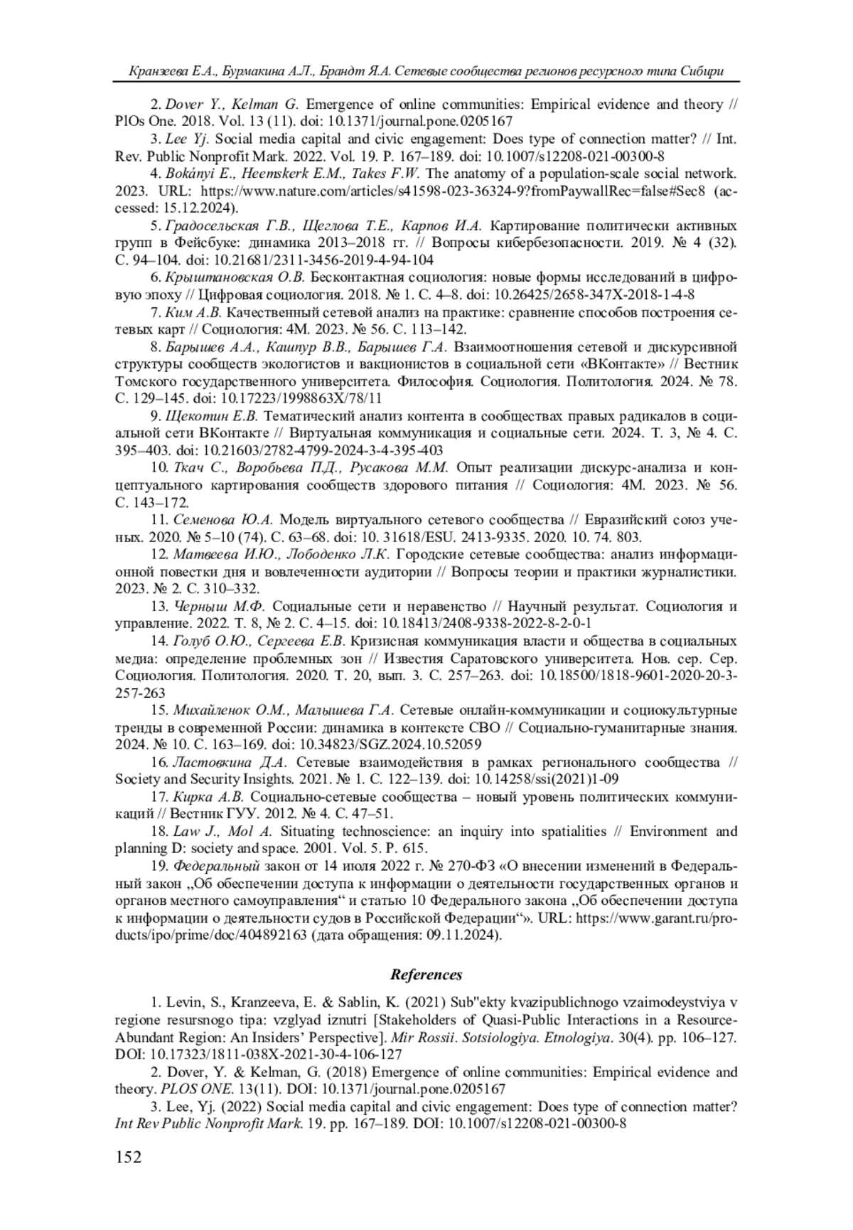 1. Левин С.Н., Кранзеева Е.А., Саблин К.С. Субъекты квазипубличного взаимодействия в регионе ресурсного типа: взгляд изнутри // Мир России. Социология. Этнология. 2021. Т. 30, № 4. С. 106-127. DOI: 10.17323/1811-038X-2021-30-4-106-127 EDN: FNLKZN