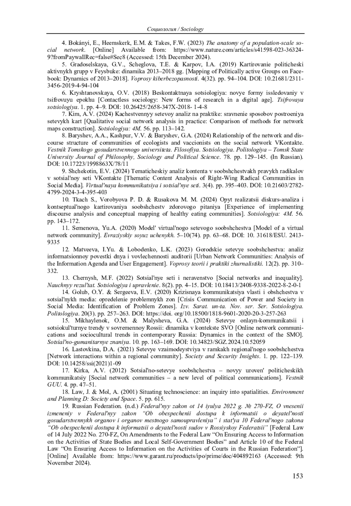 8. Барышев А.А., Кашпур В.В., Барышев Г.А. Взаимоотношения сетевой и дискурсивной структуры сообществ экологистов и вакционистов в социальной сети “ВКонтакте” // Вестник Томского государственного университета. Философия. Социология. Политология. 2024. № 78. С. 129-145. Х/78/11. DOI: 10.17223/1998863 EDN: OOZELU