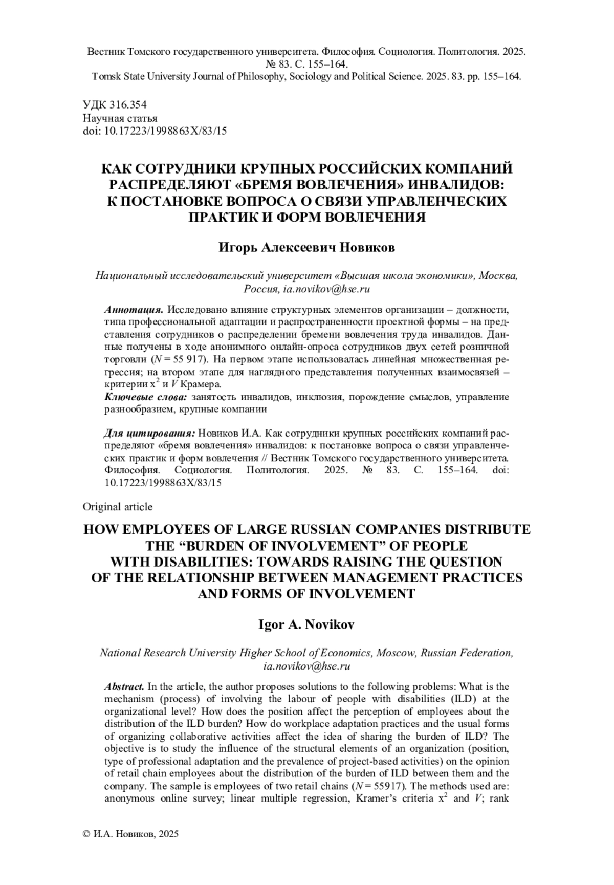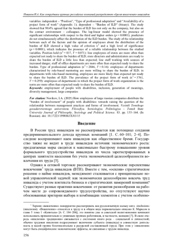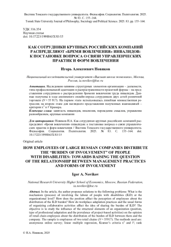 Исследовано влияние структурных элементов организации - должности, типа профессиональной адаптации и распространенности проектной формы - на представления сотрудников о распределении бремени вовлечения труда инвалидов. Данные получены в ходе анонимного онлайн-опроса сотрудников двух сетей розничной торговли (N = 55 917). На первом этапе использовалась линейная множественная регрессия; на втором этапе для наглядного представления полученных взаимосвязей - критерии х2 и V Крамера.