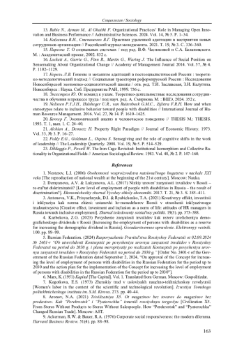 19. Nelissen P.T.J.H., Hulsheger U.R., van Ruitenbeek G.M.C., Zijlstra F.R.H. How and when stereotypes relate to inclusive behavior toward people with disabilities // International Journal of Human Resource Management. 2016. Vol. 27, № 14. P. 1610-1625.