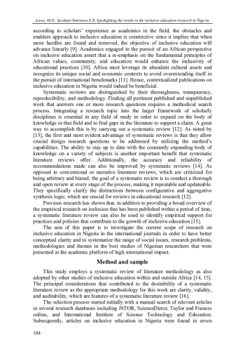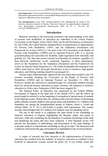 Показаны текущие тенденции, проблемы и перспективы в области инклюзивного образования в Нигерии на материалах систематического анализа крупнейших периодических изданий. Анализ выявил пробелы в поле научных исследований, касающиеся ряда аспектов инклюзивного образования в Нигерии. В существующих исследованиях в международных журналах основное внимание уделяется инвалидности, при этом авторы обходят стороной вопросы гендера, социально-экономического статуса, этнической принадлежности, а также другие измерения социального исключения.