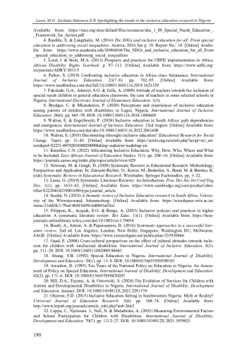 9. Walton, E. & Engelbrecht, P. (2024) Inclusive education in South Africa: path dependencies and emergences.International Journal of Inclusive Education. 23rd August. [Online] Available from: https://www.tandfonline.com/doi/abs/. DOI: 10.1080/13603116.2022.2061608