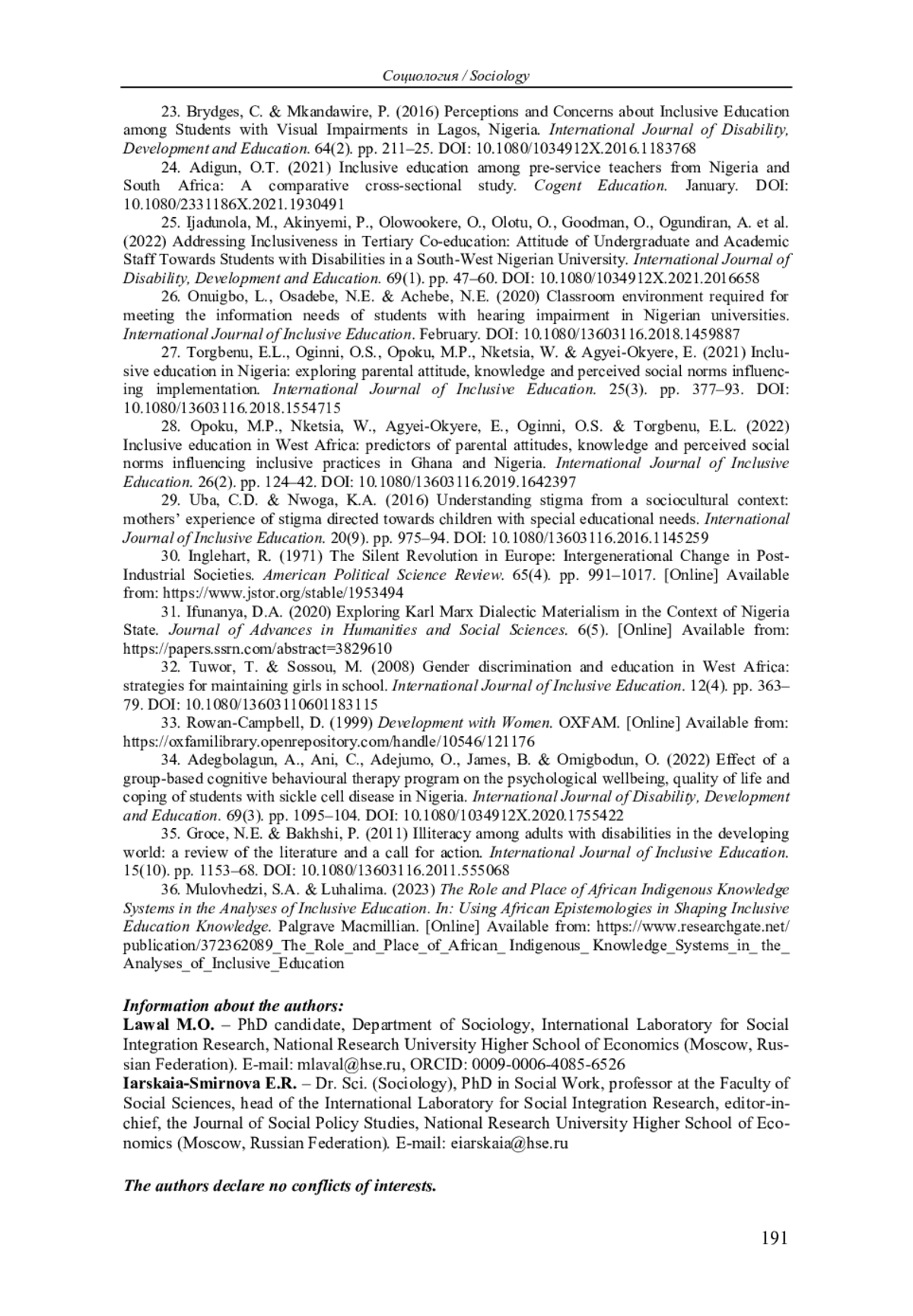 24. Adigun, O.T. (2021) Inclusive education among pre-service teachers from Nigeria and South Africa: A comparative cross-sectional study. Cogent Education. January. DOI: 10.1080/2331186X.2021.1930491