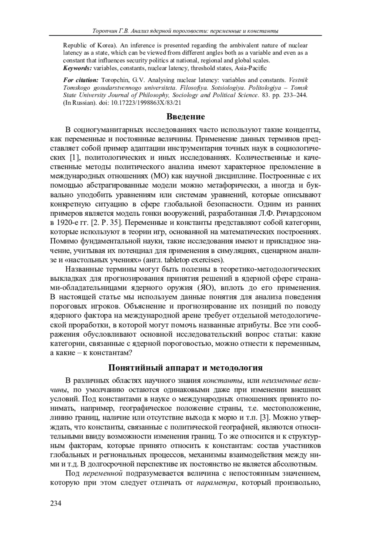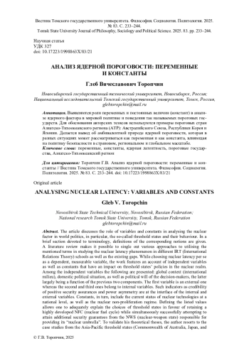 Выявляются роли переменных и постоянных величин (констант) в анализе ядерного фактора в мировой политике и поведения так называемых пороговых государств. Для обоснования авторских тезисов используются примеры пороговых стран Азиатско-Тихоокеанского региона (АТР): Австралийского Союза, Республики Корея и Японии. Делается вывод об амбивалентной природе ядерной пороговости, которая в разных ситуациях может рассматриваться как переменная и как константа, влияющая на политику безопасности в страновом, региональном и глобальном масштабе.