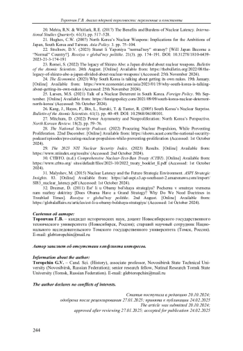 23. Romei S. The legacy of Shinzo Abe: a Japan divided about nuclear weapons // Bulletin of the Atomic Scientists. August 24, 2022. URL: https://thebulletin.org/2022/08/the-legacy-of-shinzo-abe-a-japan-divided-about-nuclear-weapons/(accessed: 25.11.2024).