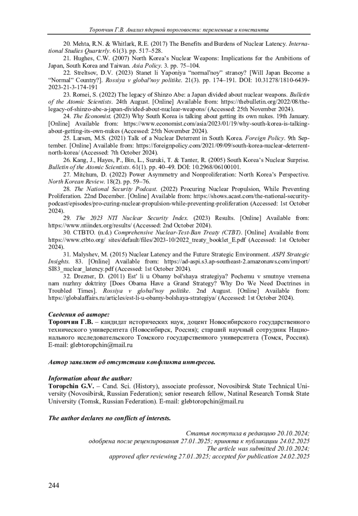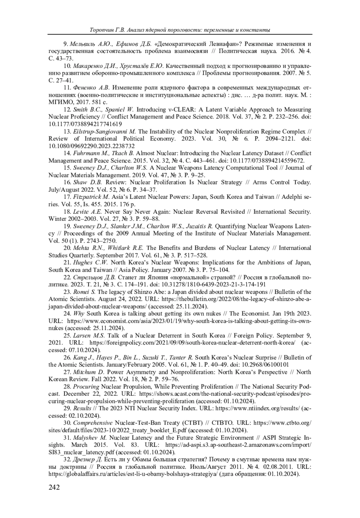31. Malyshev M. Nuclear Latency and the Future Strategic Environment // ASPI Strategic Insights. March 2015. Vol. 83. URL: https://ad-aspi.s3.ap-southeast-2.amazonaws.com/import/SI83_nuclear_latency.pdf (accessed: 01.10.2024).