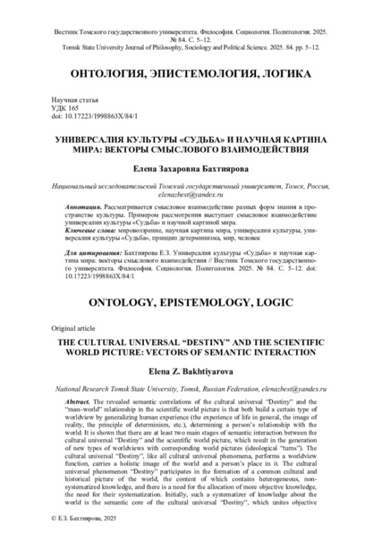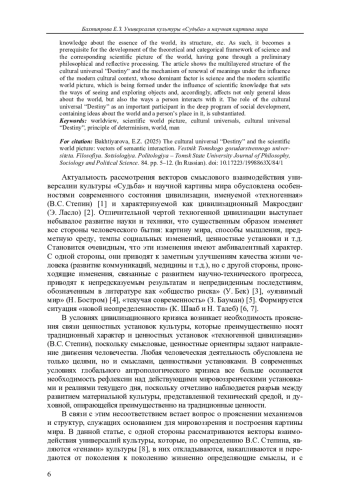 Актуальность рассмотрения векторов смыслового взаимодействия универсалии культуры «Судьба» и научной картины мира обусловлена особенностями современного состояния цивилизации, именуемой «техногенная» (В. С. Степин) [1] и характеризуемой как цивилизационный Макросдвиг (Э. Ласло) [2].
