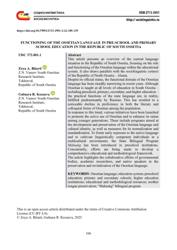 В статье дается обзор языковой ситуации в Республике Южная Осетия, анализ функционирования осетинского языка в сфере образования, даются параллели с социолингвистической ситуацией в Республике Северная Осетия-Алания. Несмотря на государственный статус, сфера применения осетинского языка в последние годы неуклонно снижается, хотя осетинский язык в Южной Осетии изучается в образовательных заведениях всех уровней: дошкольных, начальной и средней школах и в вузах. Фактически функции государственного языка выполняет русский язык, что ведет к снижению уровня владения осетинским литературным, а также разговорно-бытовым языком. Для того чтобы остановить этот процесс предпринимаются шаги по продвижению осетинского языка в сферу активного использования и популяризации среди подрастающих поколений, реализуются государственные программы по развитию и сохранению осетинского языка и идентичности, а также меры по его нормированию и стандартизации. Для приобщения подрастающего поколения к родному языку и формированию языковой личности в поликультурной среде в дошкольные учреждения внедрена Государственная билингвальная программа «Малусǽг», ведется разработка учебно-методической базы. Показано объединение усилий государственной власти, исследователей и общественности в деле сохранения осетинского языка.
