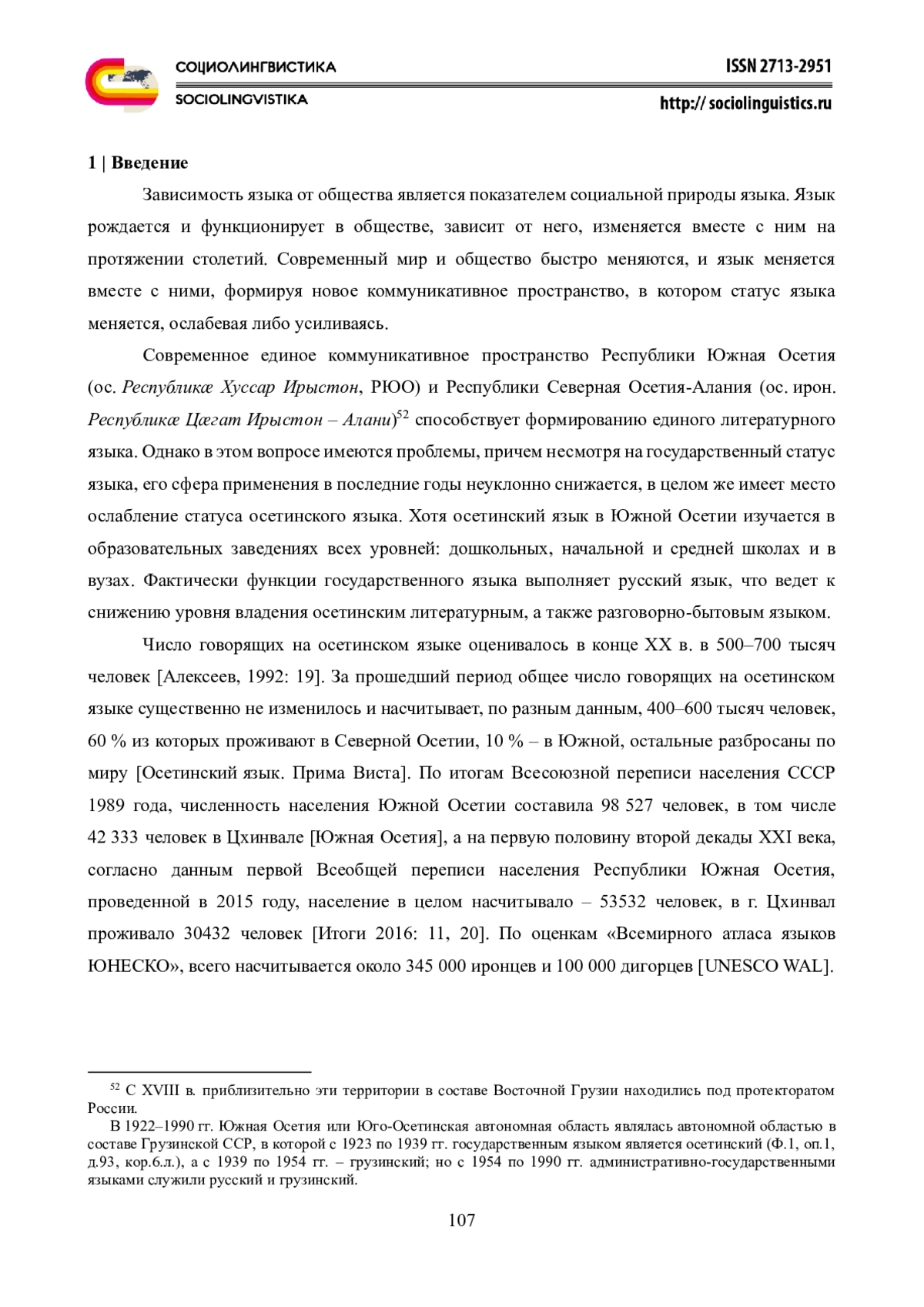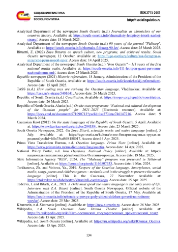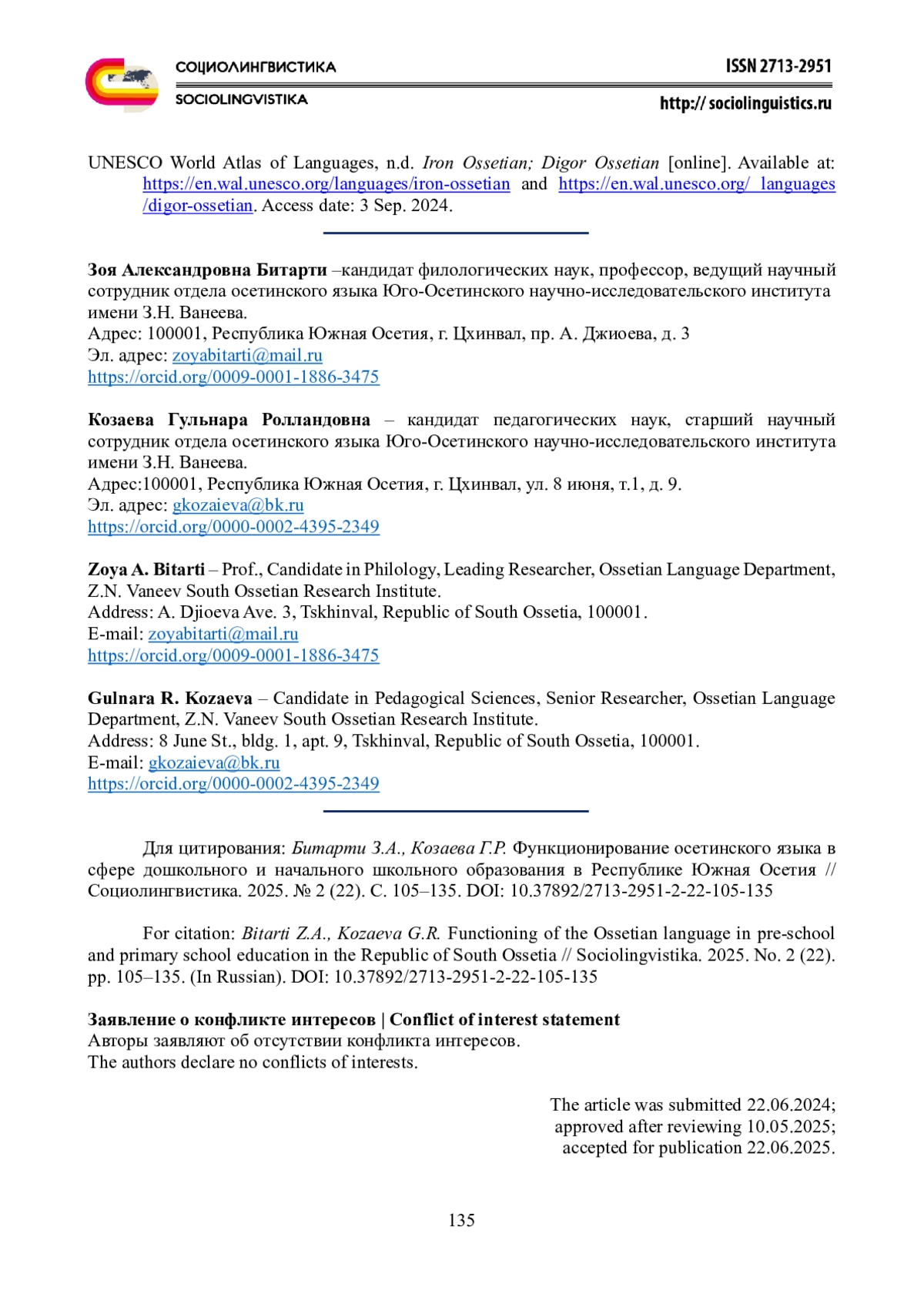 4. Бесолова Е.Б., Закаева Б.К., Джиоева В.П., Денисенко А.В., Калинина Ю. М. (2021) Языковая ситуация и статус языков в Республике Северная Осетия-Алания, Вестник РУДН. Серия, Теория языка. Семиотика. Семантика. №4. С. 1250. EDN: TEFOSH