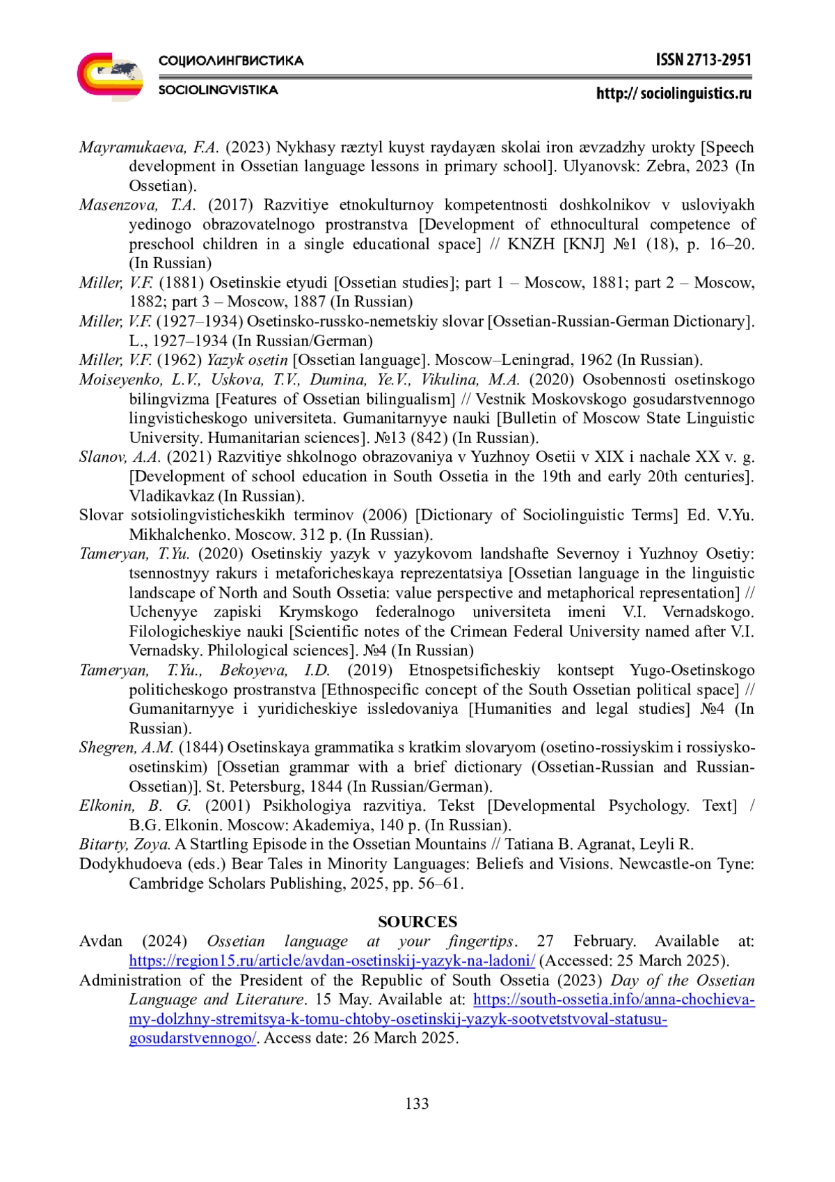 26. Тамерьян Т.Ю. (2020) Осетинский язык в языковом ландшафте Северной и Южной Осетий, ценностный ракурс и метафорическая репрезентация, Ученые записки Крымского федерального университета имени В. И. Вернадского. Филологические науки. №4. С. 184. EDN: SQESPI
